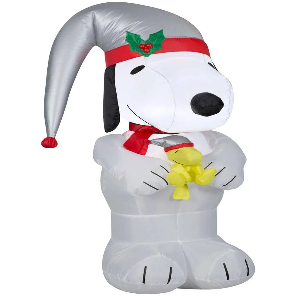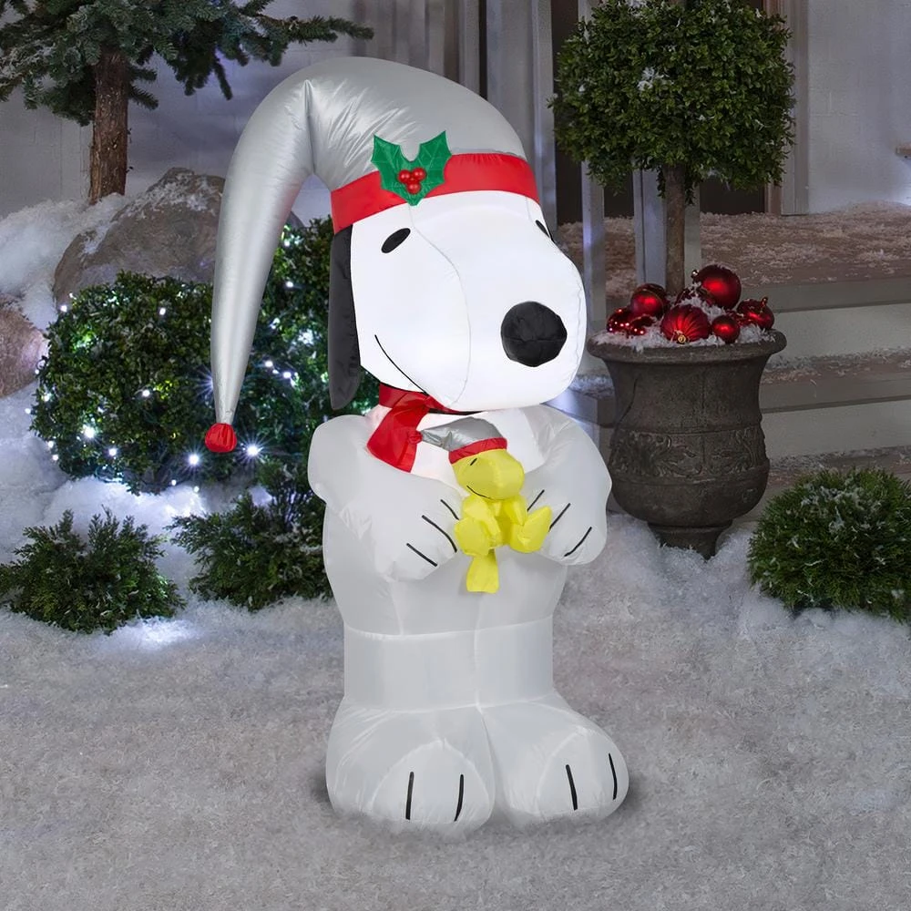 Deck the yard with an Airblown Inflatable featuring Snoopy and Woodstock in shiny silver stocking hats. Our adorable Peanuts inflatable makes an eye-catching addition to your outdoor Christmas decorations. Setup is super simple. Just plug it in, stake it down and watch the magic unfold. Includes everything needed for easy outdoor setup.