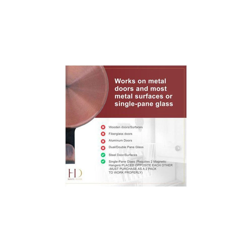 For use on metal doors and SINGLE PANE glass (does NOT work on dual pane glass or non-metal surfaces). Hang heavy wreaths and other door decor with this super-strong Magnetic Wreath Hanger. The elegant finish will complement your door hardware. No fear of scratches, as each hanger has a pad on the back to protect your door. While intended primarily for metal doors, the hangers can also be used around the house in a variety of applications.