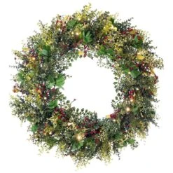 Christmas Wreaths are a must have if you want to impress your guests during the holidays, and this one of a kind wreath is sure to meet those expectations. The Boxwood and Berry wreath is a pre-lit, remote-controlled, battery-operated Wreath with 50 LED mini lights. 30 in. from tip to tip, the Boxwood and Berry wreath features a handcrafted design complete with boxwood leaves and red and yellow berries to give a modern touch on traditional wreaths. The life-like artificial wreath is perfect either indoors or outdoors, whether you want to hang it above your fireplace mantle, or display it on your front door.