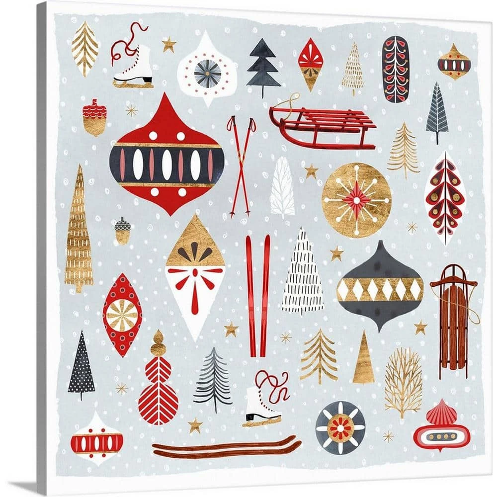 Solid-Faced Canvas Print entitled Christmas Chalet IV . Christmas and winter themed items embellish a soft blue sky with falling snow in this decorative holiday decor. Our proprietary canvas provides a classic and distinctive texture. It is acid free and specially developed for our giclee print platforms. Each print is produced with our own archival UV quality inks supporting a vibrant color gamut, while being scratch and fade resistant. Each premium canvas gallery wrap is finished with a closed back preventing dust collection inside the back of the wrap. The back includes a pre-installed, ready-to-hang sawtooth hardware.