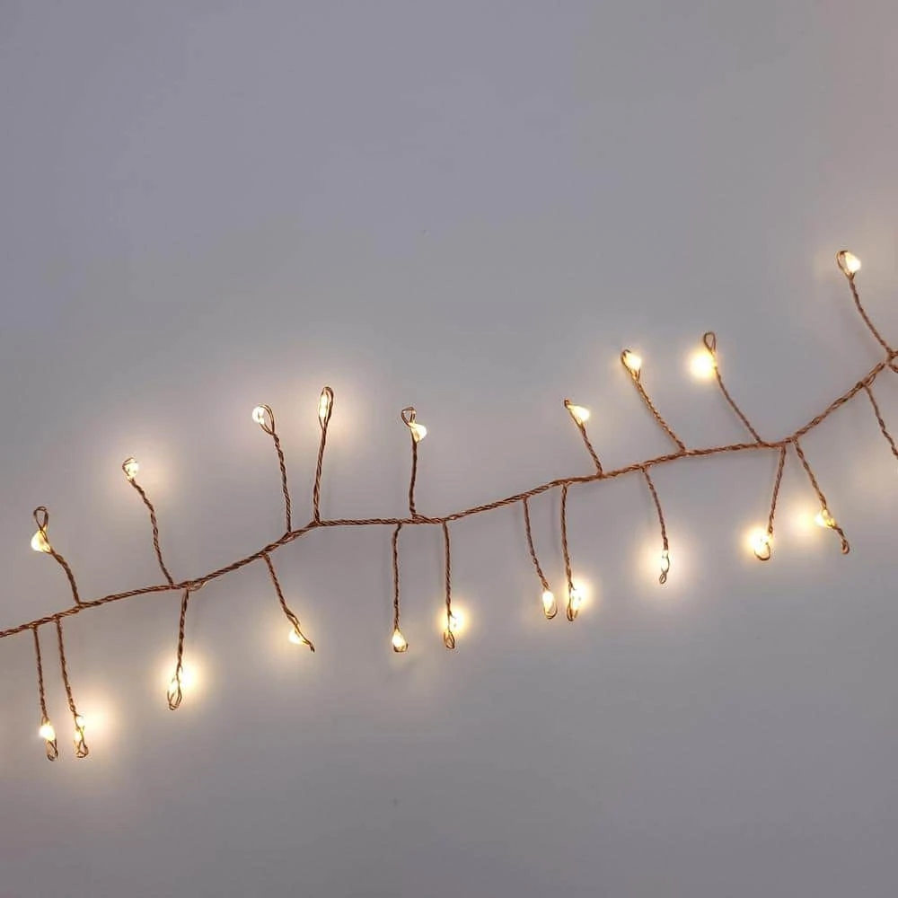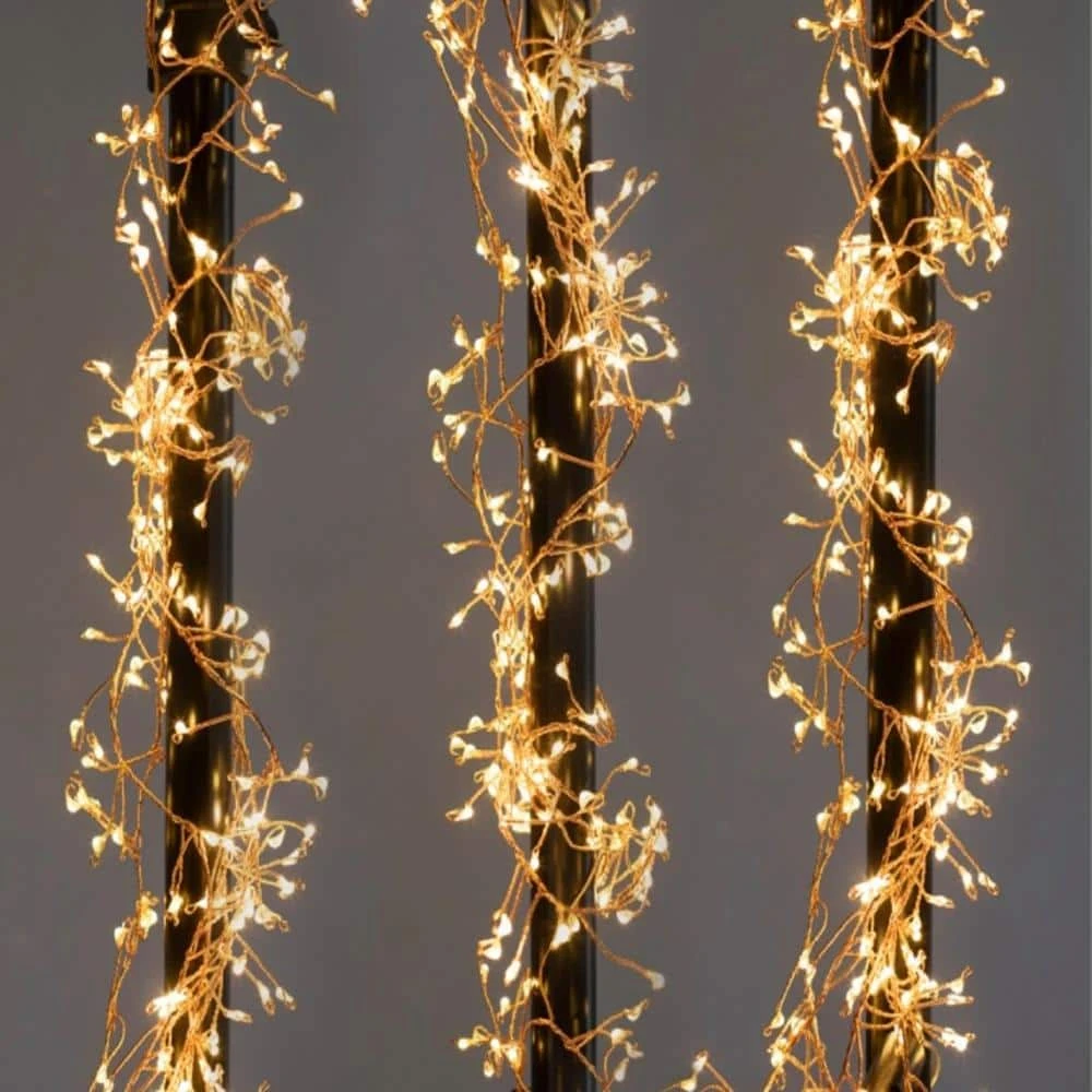 Electric firecracker fairy string lights will bring a spectacular ambience to a special event or your everyday home decor. This strand of bendable wire with three hundred 1.5″ off-shoots, each with a mini LED light attached to the end, creates a firecracker design. The glowing micro LED lights look like a glimmering droplet of water clinging to the end of a shiny wire. These weatherproof lights are perfect for illuminating floral arrangements, tabletop displays, mantles, ornamental bushes, and so much more. Electric firecracker lights are also known as cluster lights, fairy garland lights, or snake lights.