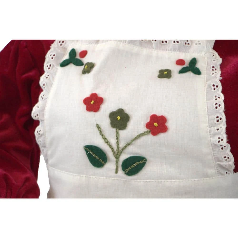 - Festive outfit: festively dressed in a white apron complete with floral applique, 2 front pockets and eyelet trim, a red velvet dress with white eyelet trim and coordinating mob-cap complete her festive style
