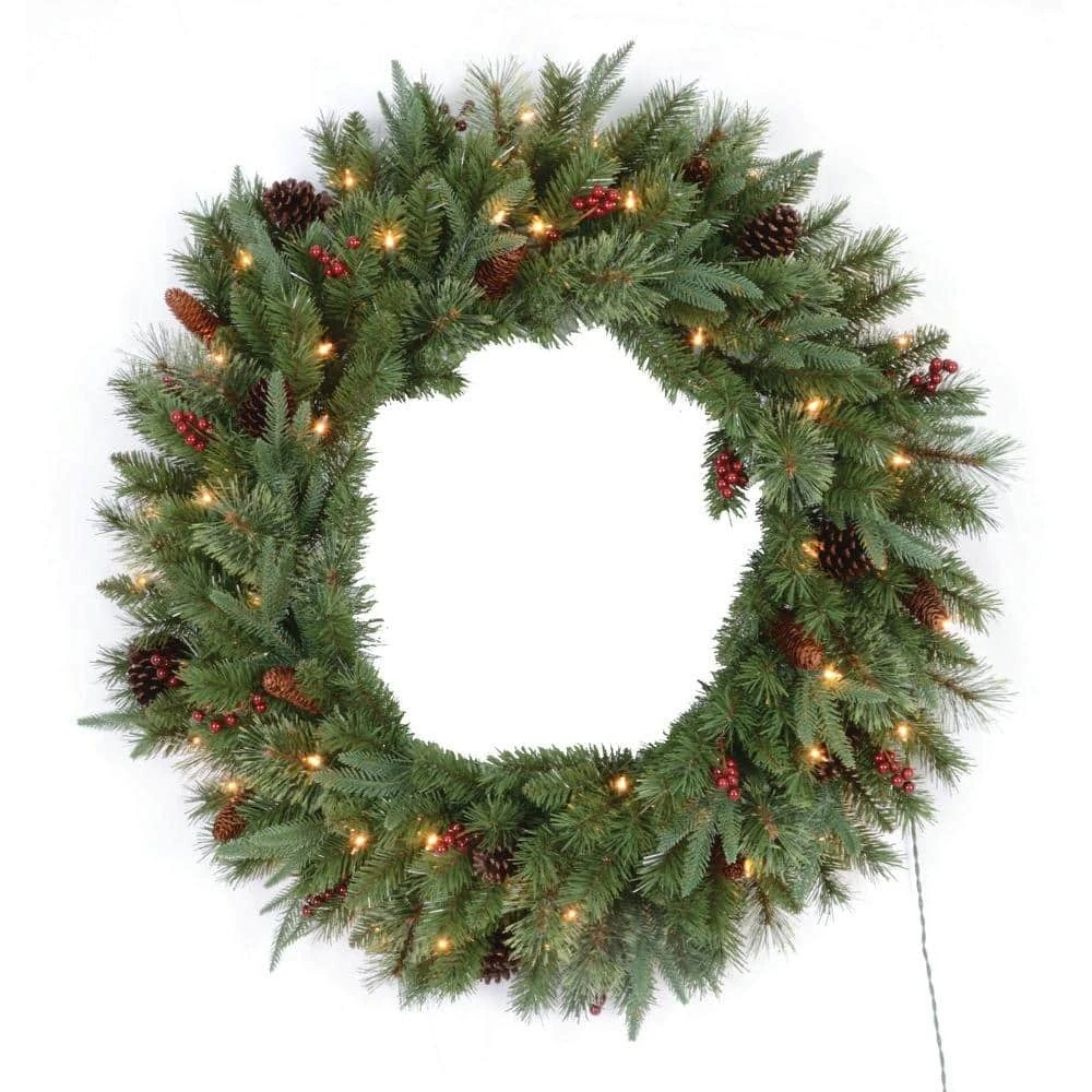 24 In. Pre-Lit Mixed Pine Artificial Christmas Wreath With 35 Clear LED Lights And Pinecones