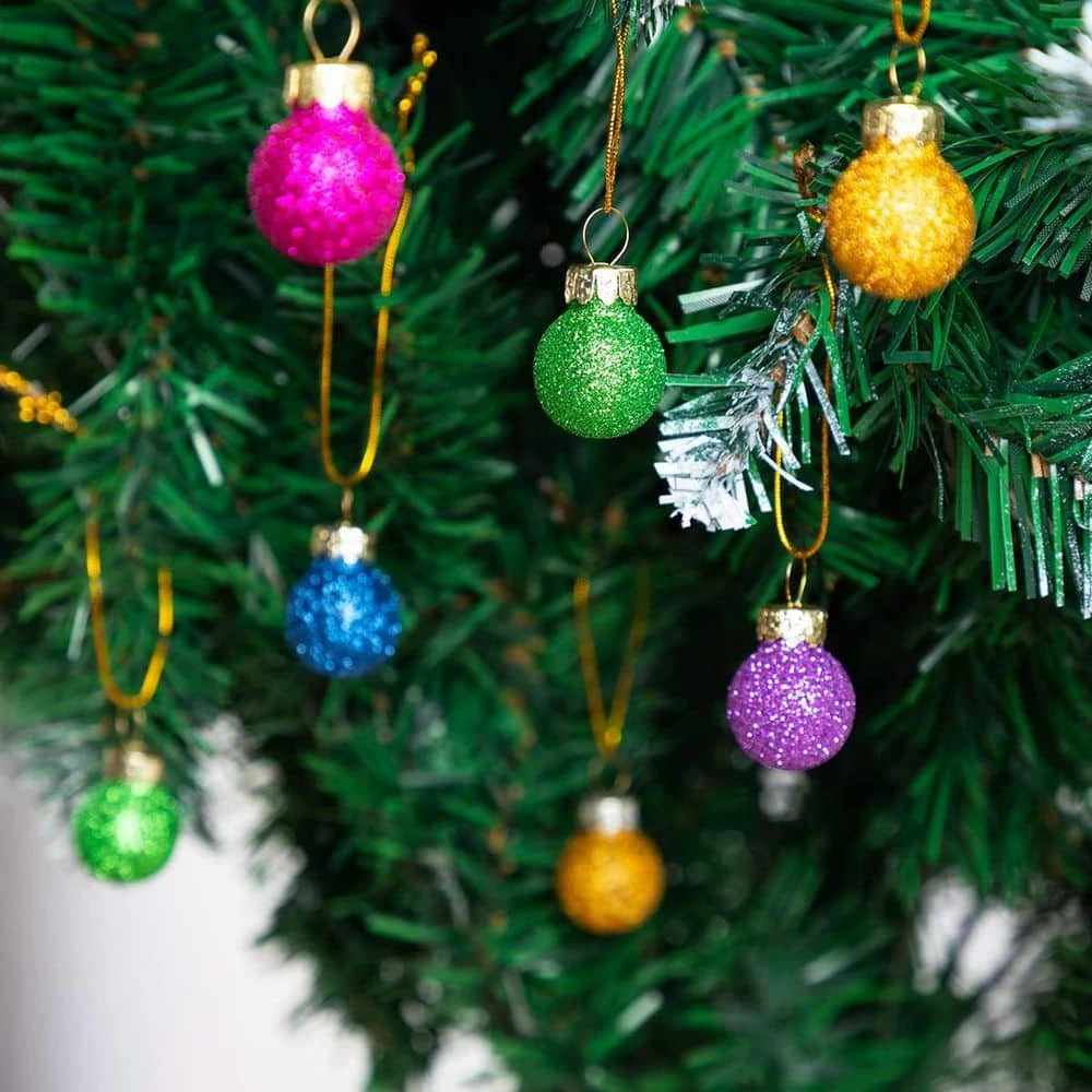 Add a sparkling touch to your tree with the 36 piece 1 in. Christmas Mini Glitter Glass Balls Ornaments by Joyfy. These mini Christmas ornaments feature a multicolor design, perfect for Christmas tree decorations. Their glass ornaments add a festive touch to your holiday decor, making them ideal for mini tree ornaments or Christmas balls. Easy to hang, these ornaments are a must-have for your holiday decorations.