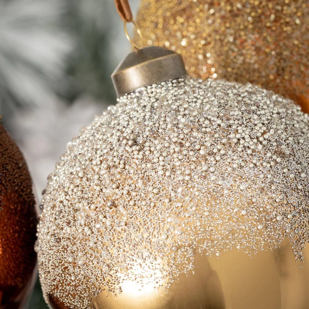 - Add a touch of opulence to your christmas tree with our ornaments in captivating gold and copper tones, featuring delicate beaded accents that catch the light beautifully