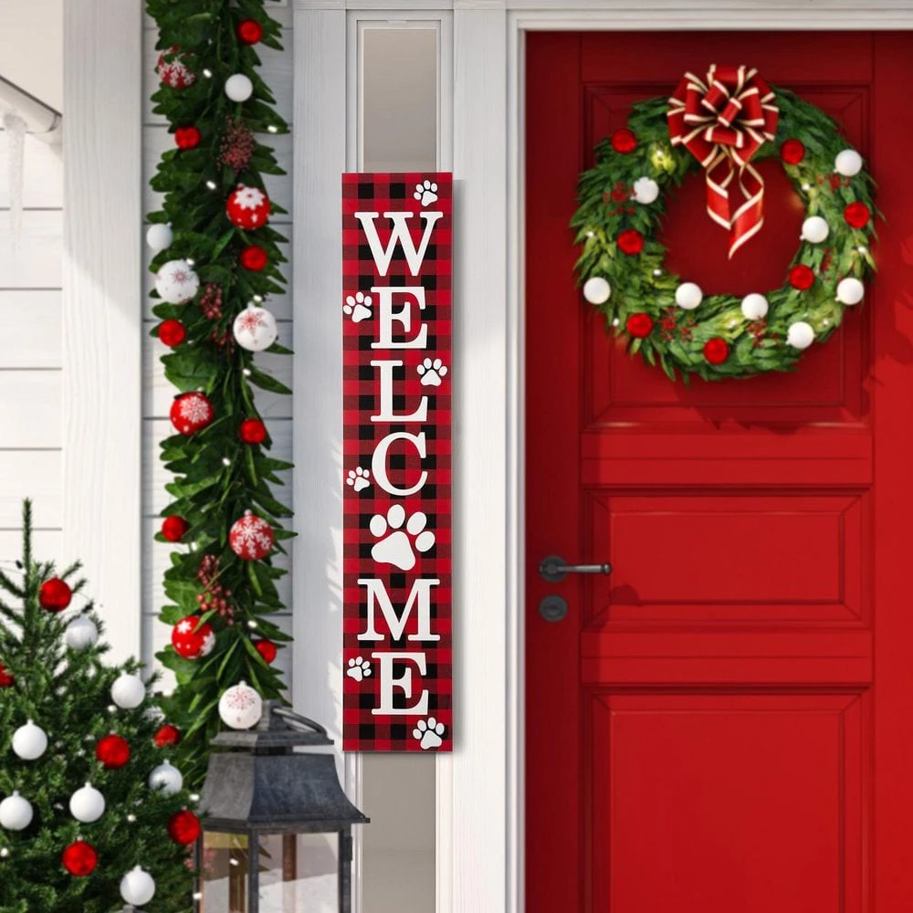 Let’s welcome your friends and relatives this holiday with this classical plaid Welcome porch sign. This porch sign features black and red plaid background and white snowflake and cute paw prints on a classical plaid background that looks very elegant and brings an understated appeal to your space. Stylish and inspirational design will be a perfect addition to your porch, garden or any living space.