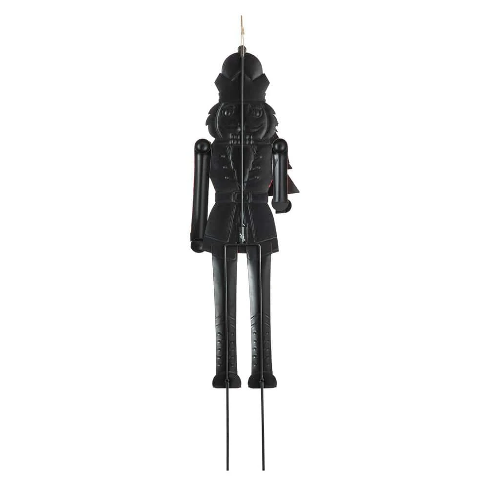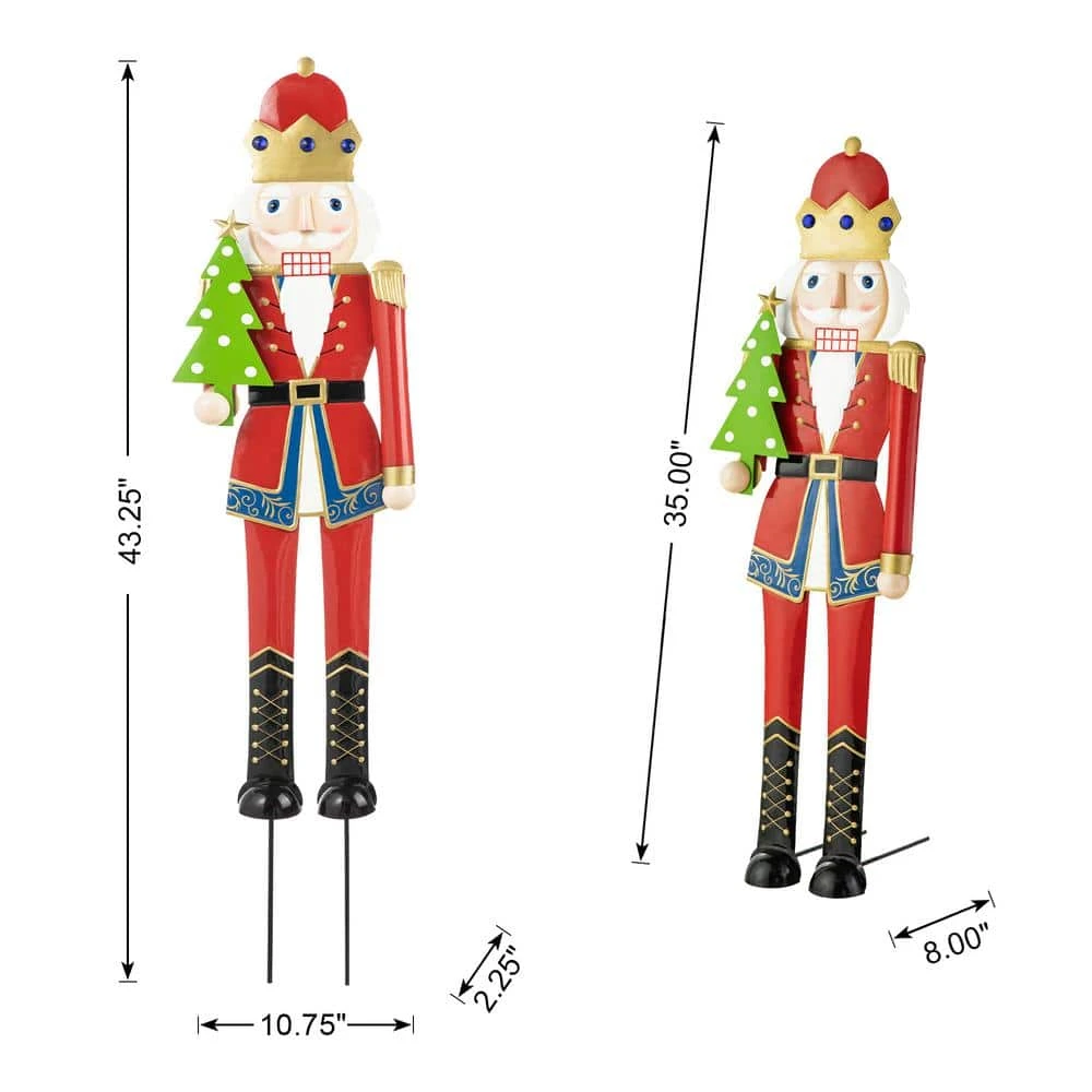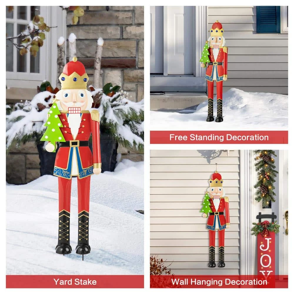 Bring seasonal greetings to your front yard with this nutcracker yard stake. It’s made of metal and features a nutcracker holding Christmas tree in his hands. Can be used as a stake or a wall hanging decorating and leaning decoration without metal poles. It also offers a delightful way to greet guests on the front porch or to add a splash of color and character out on back yard like a guardian.