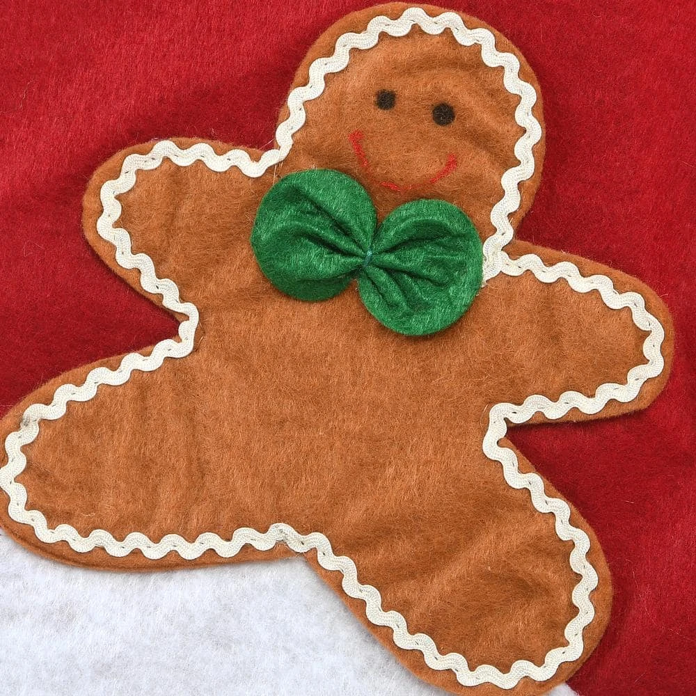 Add a fun finishing touch to your Christmas centerpiece with this tree skirt featuring a snow-topped gingerbread house. Made of 100% polyester, this red skirt with white border is also decorated with a couple bowtie wearing gingerbread cookies and dotted with starburst candy cutouts. The split seam design allows for easy placement with Velcro tabs included to close and secure the seam.