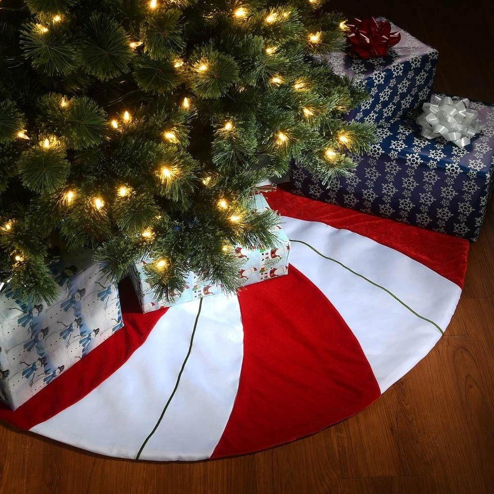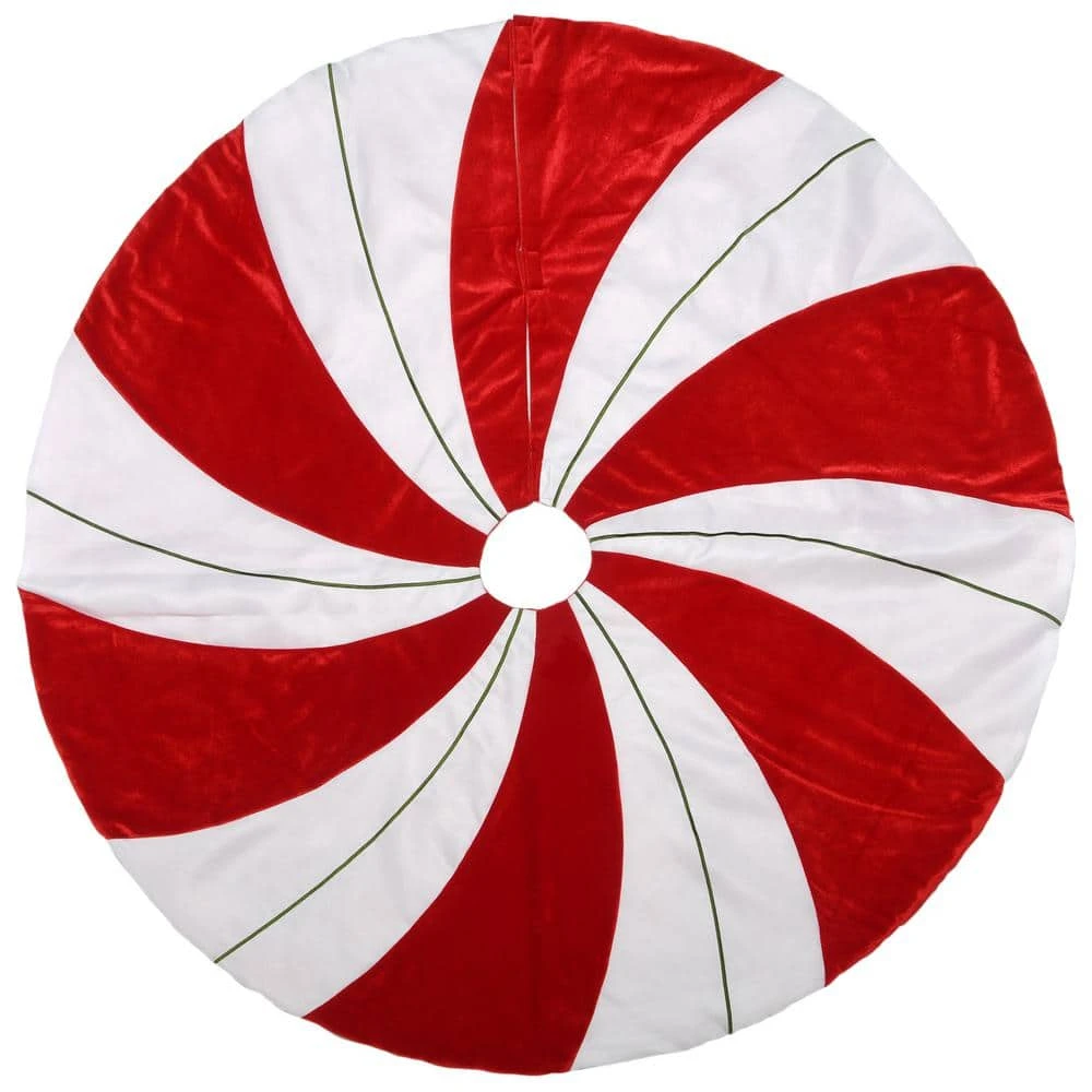 Add the finishing touch by surrounding the base of your Christmas centerpiece with this bright and fun tree skirt. Made of 100% polyester, this skirt features the unmistakable shape of a peppermint candy with its swirling red and white motif. The split seam design allows for easy placement with Velcro tabs included to close and secure the seam.