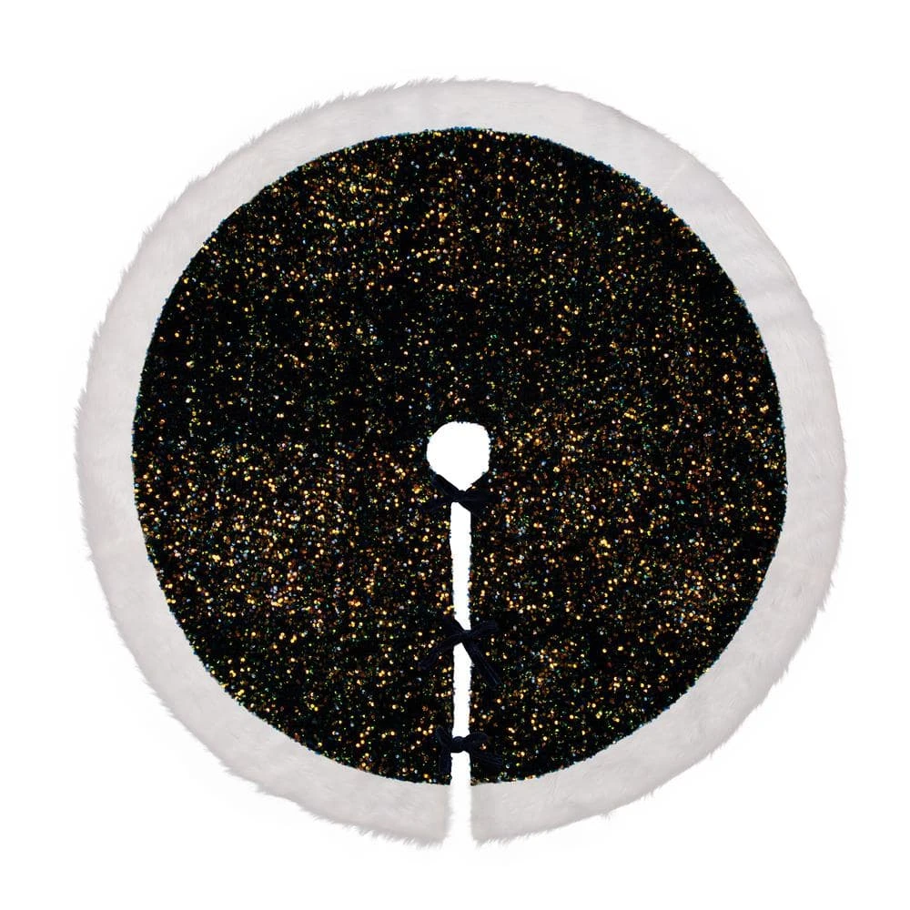 The 48 in. D blue sequin tree skirt decorated with white faux fur cuff. Blue velvet ropes attached for your easy knotted. Dress up your Christmas tree with this gorgeous sequin tree skirt.