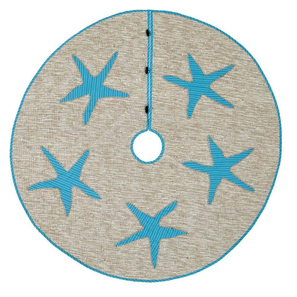 Tastefully adorned by starfish, the Nerine Tree Skirt is a fun addition to the beach Christmas look. The skirt features a textured natural shade cotton jute with appliqud starfish on a ocean blue striped seersucker. Accented with natural braided rope, peal and star studs. Included wooden toggle closures.