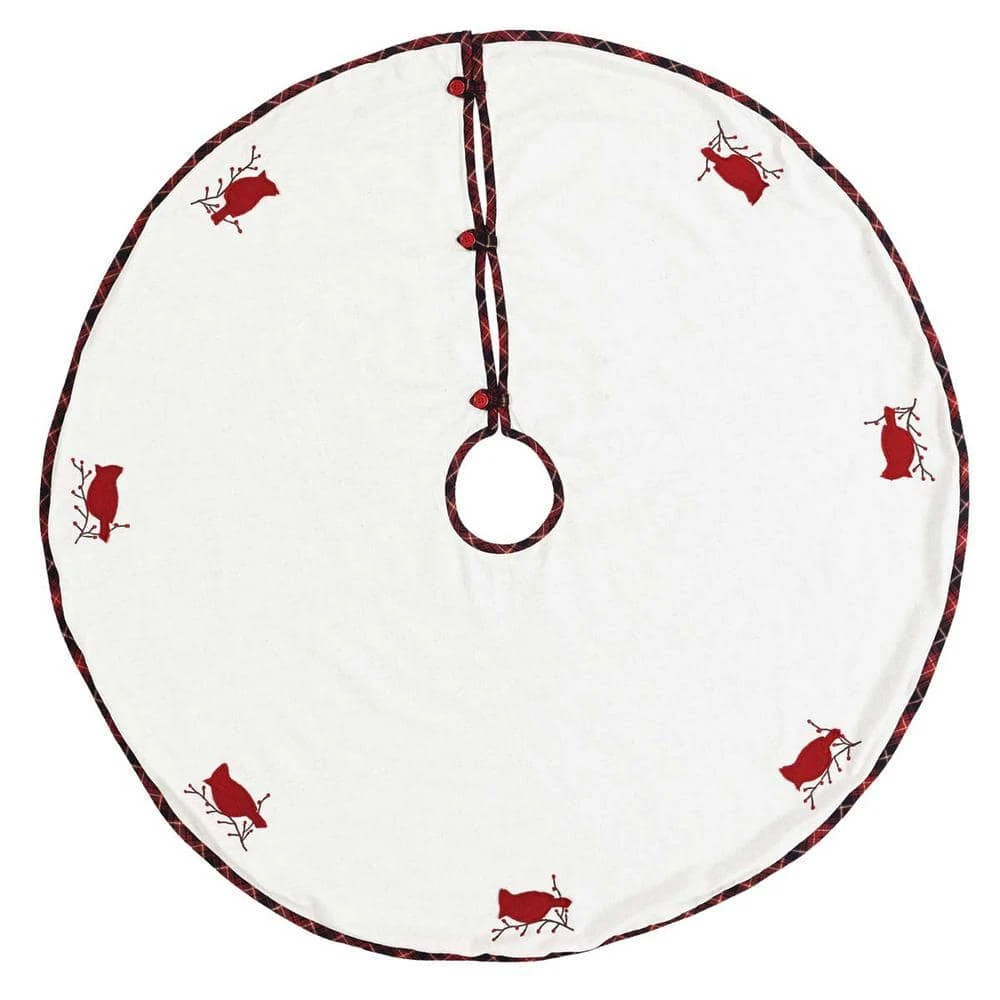 Red felt winterberries and cardinals provide the rural holiday themed backdrop to the Seasons Greetings Tree Skirt 48 in. An all cotton crisp cream provides an eye catching base for the applique and embroidered designs. Red, black, and creme plaid trim the edges to complete the look. Reversible to red, black, and creme plaid with red chalk summary closures to secure the skirt around the tree.