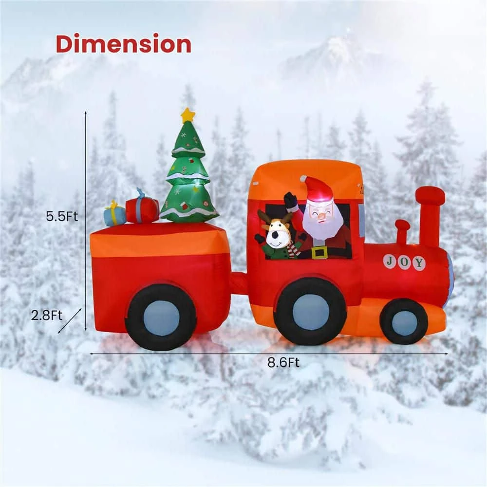 - Lighted Christmas Train: The 6 bright LED lights in the inflatable train will look great during the day and incredible at night, making your yard more eye-catching. Your yard will be noticed this Christmas with this unique inflatable. The train features elements of Christmas tree, Santa & deer, and gift boxes for strong festival atmosphere.