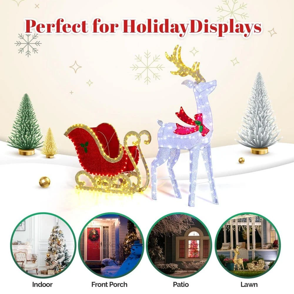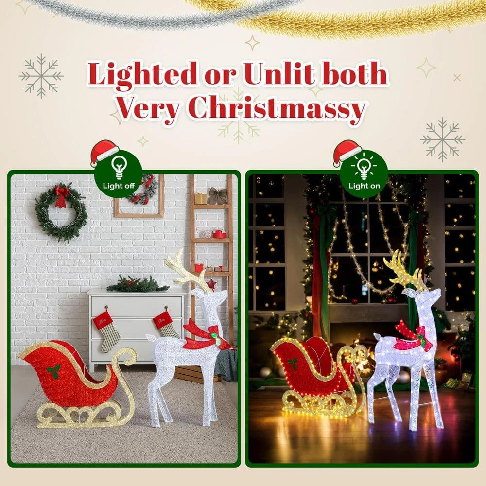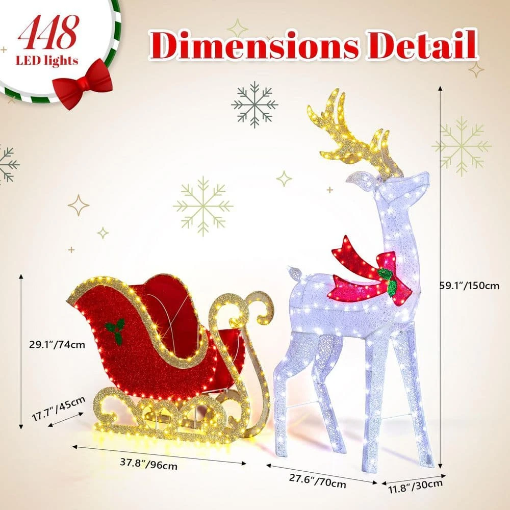 - Majestic 5 ft. display with 448 leds: command attention with a large, elegant white reindeer pulling a bright red sleigh, illuminated by a brilliant mix of warm white and cool white lights for a captivating glow