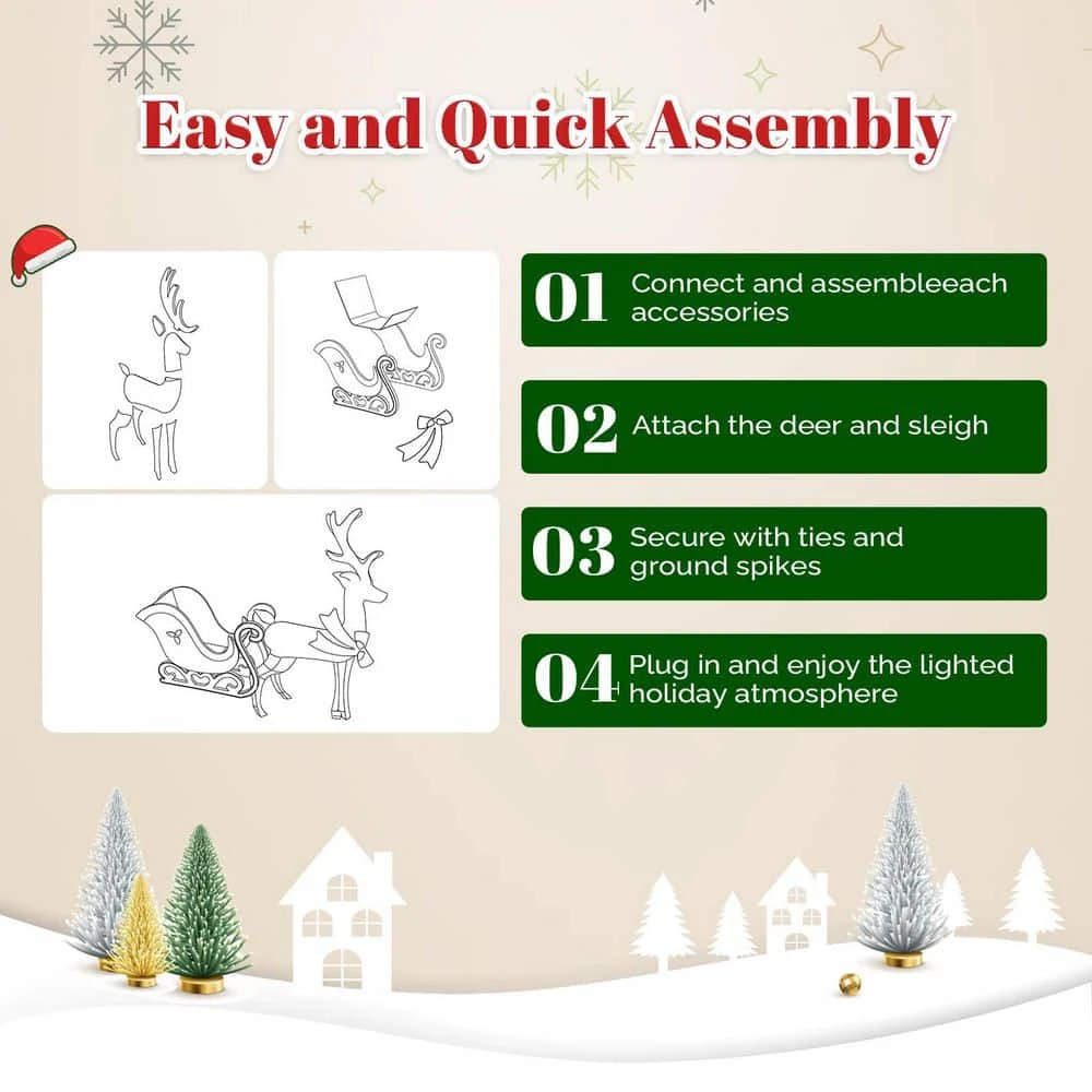 Create an enchanted winter scene with our majestic 5 ft. lighted reindeer and sleigh. Transform your home or garden into a festive wonderland with this stunning centerpiece. Featuring a graceful white reindeer pulling a vibrant red sleigh, both adorned with a dazzling display of 448 warm white and cool white LED string lights, this decoration radiates pure holiday magic. Crafted with a durable, weather-resistant fabric cover over a sturdy frame, it’s built to shine brightly indoors or outdoors throughout the season. Operating safely at 12V and only 8.4W, it’s energy-efficient and simple to use. Enjoy quick, tool-free assembly – once set up, its stable design ensures it stands proud and secure, creating a breathtaking focal point for your lawn, porch, patio, or living room.