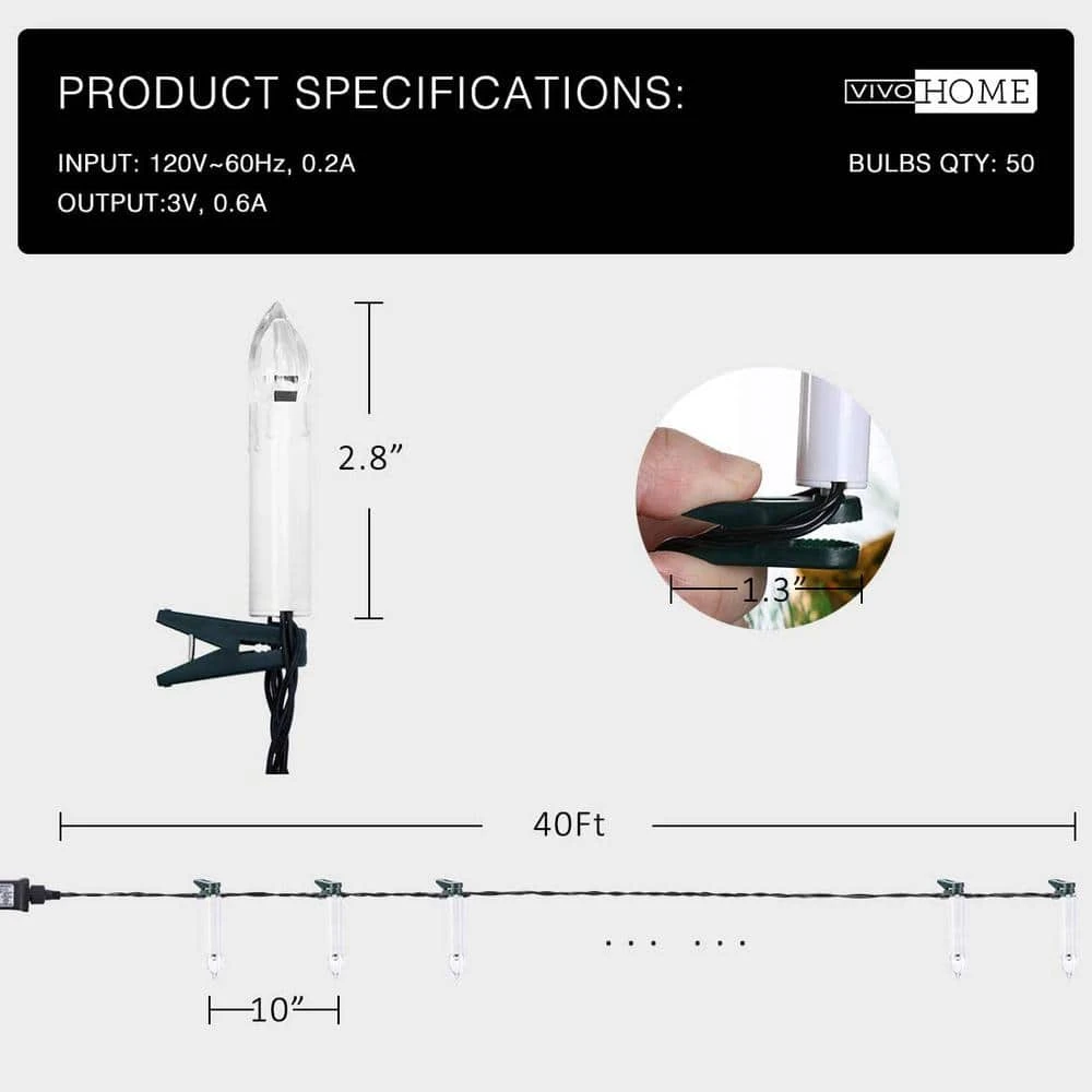- Set features 50 elegant white LED bulbs sitting atop realistic candles with dripping wax and clips on the bottom that allow for neat, convenient decorating