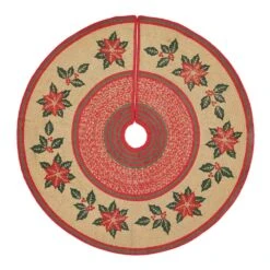 Nothing says Christmas like the beautiful poinsettia. Traditional poinsettias and holly berries are stenciled in holly berry red and forest green on natural braided jute. This item was made with care to decorate your home for many years.
