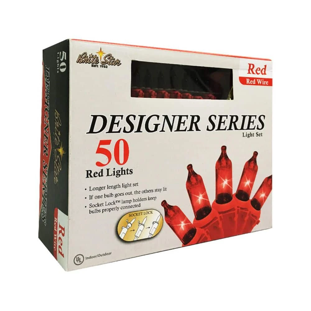 50-light designer series light set, red, red wire. 18 in. x 4.25 in. sp x 3.5 in., total length approximatly 19 ft., maximum connect: 9-sets. Socket lock keeps bulb properly secured. Set wattage: 21.25-Watt, Ul Listed, indoor/outdoor use. Replacement bulb: 2 -Piece, red/pink, (2.5-Volt/170 ma), replacement fuse: 1-piece. Warranty: 2-years.