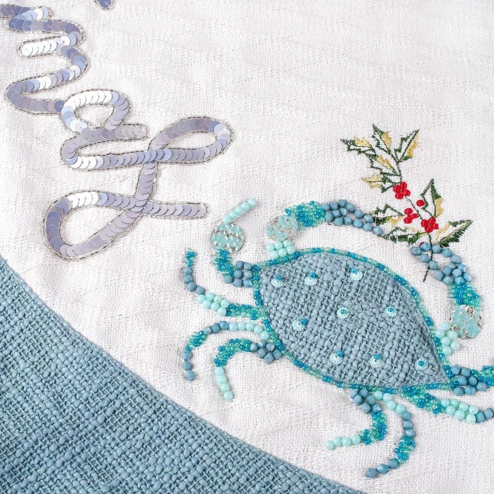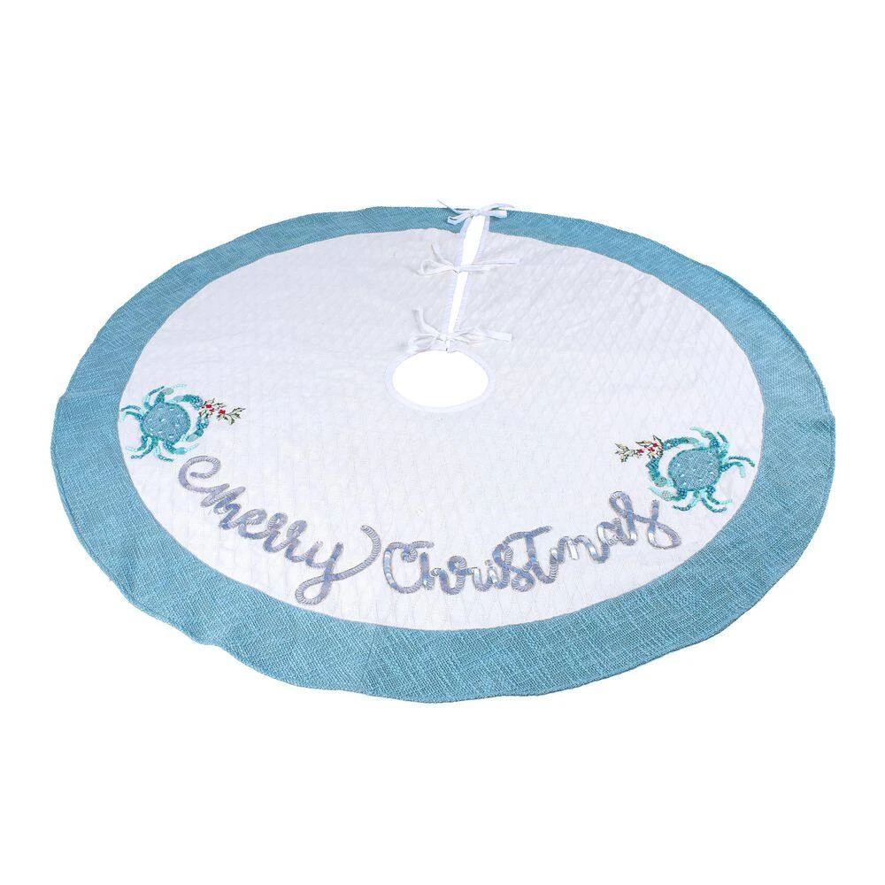 Add a fun and whimsical finishing touch to your Christmas centerpiece. This sea-shore flavored tree skirt featuring blue tones. This has a wide accent border.