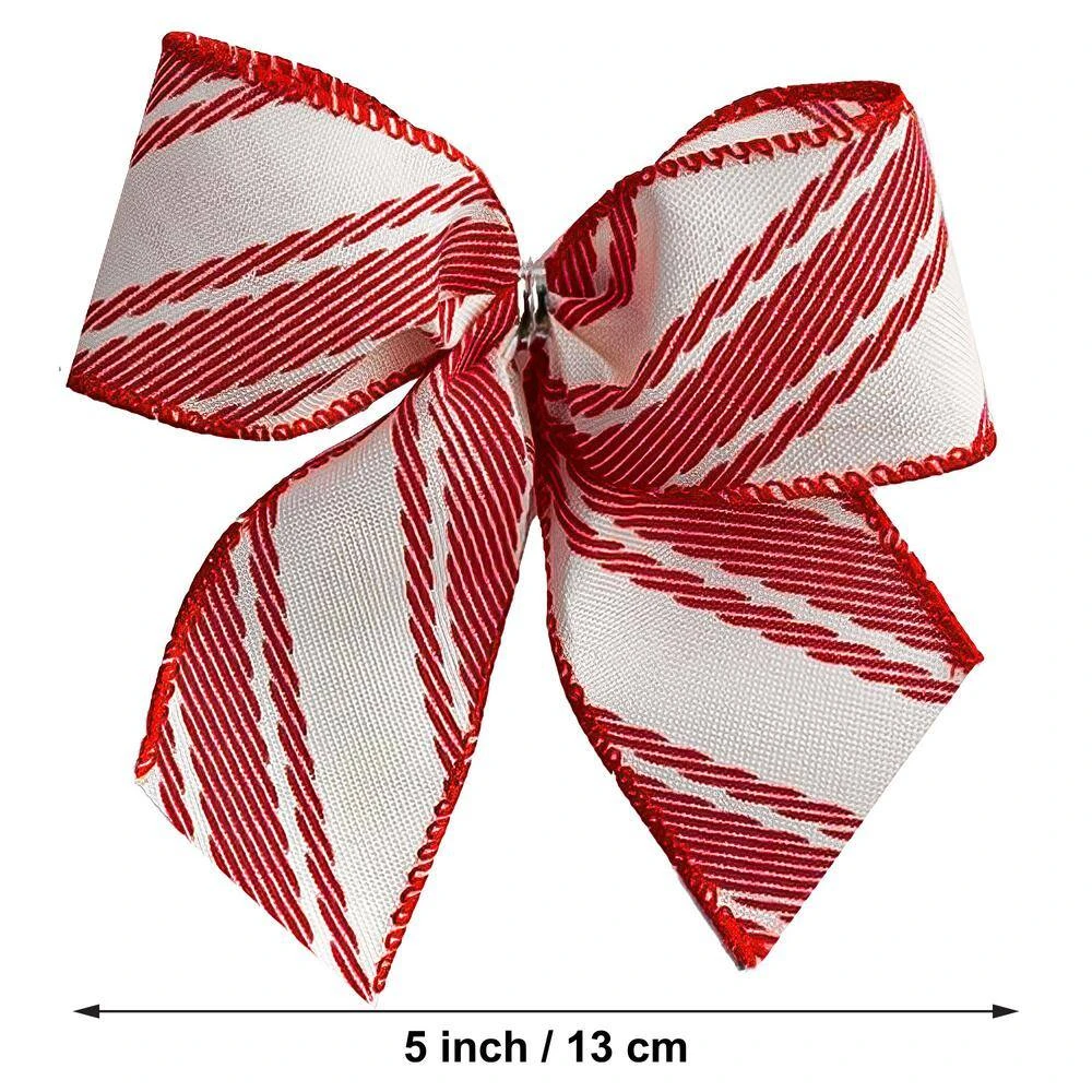 The New Traditions Large Christmas Tree Topper Bow and 12 Mini Bows Bundle is an elegant addition to any holiday decor. The set is made from designer-quality satin ribbon with wired edges, making both the loops and tails effortless to style and shape. A single extra-long bow fashioned from wide satin ribbons can be used as a Christmas tree topper or arranged with a few Christmas ornaments as a focal point holiday decoration on a mantle, front door or porch railing. The lavish decorative bow measures 11 in. across and features sixteen loops made from 2.5 in. W satin ribbon in a festive pattern of ivory and red stripes. The tails are fashioned from the same wired ribbon and measure 53 in. L. The set also includes twelve smaller 2-loop decorative bows measuring 5 in. x 5 in., crafted from 2 in. satin ribbons in the same stripe fabric. The built-in twistable wires make them easy to attach to Christmas trees, holiday wreaths, bannisters, railings, mantles and anywhere else you might want to decorate with these festive holiday trimmings. Perfect for both indoor and outdoor decoration, these durable, high quality Christmas bows are reusable holiday decorations year after year.