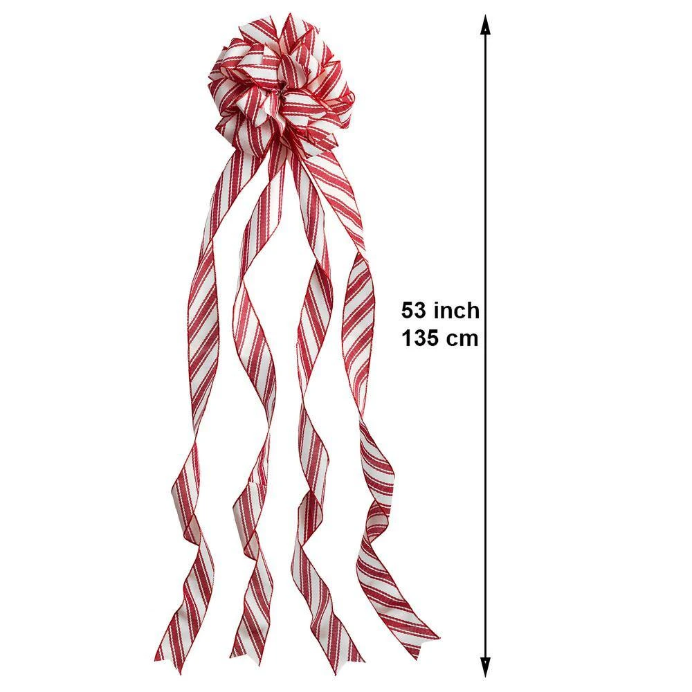 - Features 1 extra-long 16-loop tree-topper bow measuring 53 in. x 11 in. and made from wide 2.5 in. satin ribbons, as well as twelve matching 2-loop bows that measure 5 in. x 5 in. and are crafted from 2 in. satin ribbons