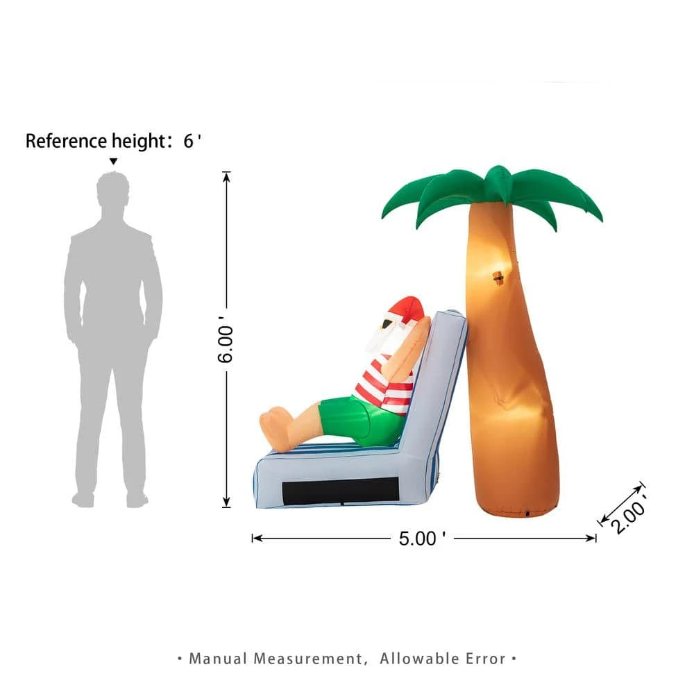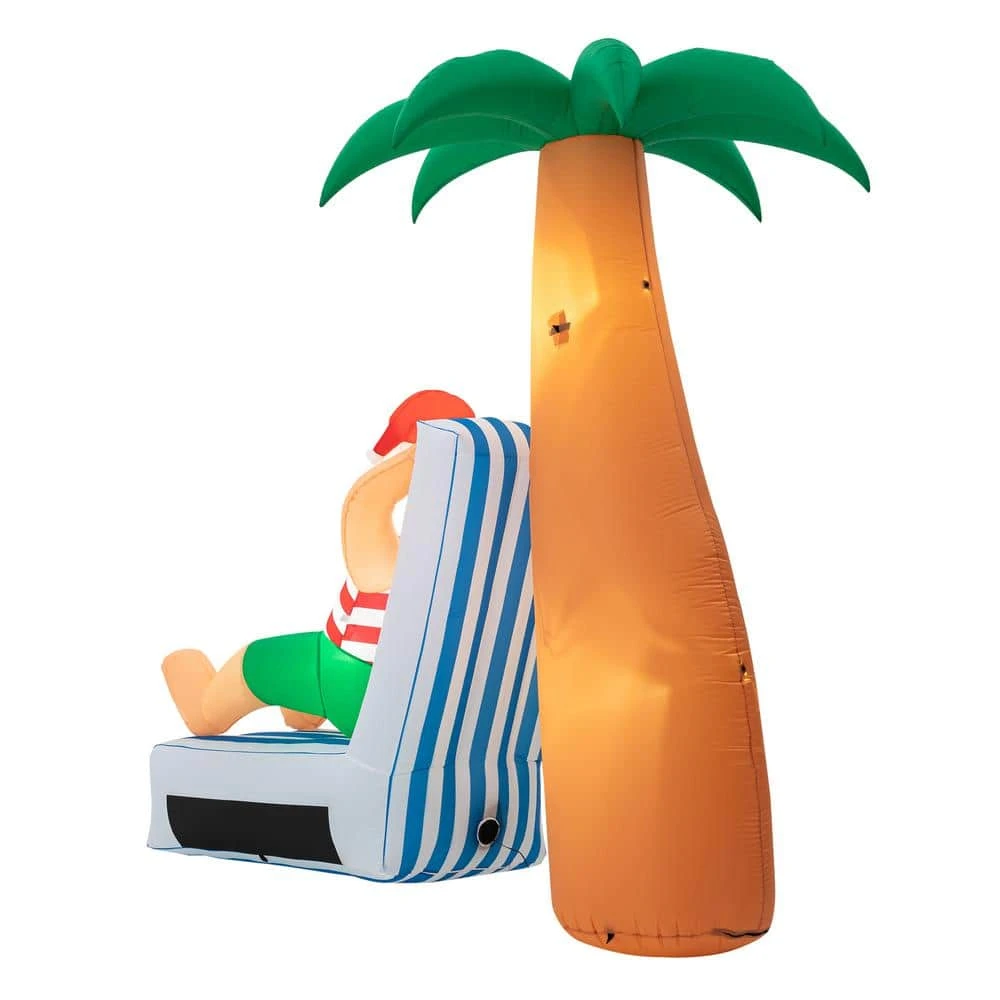 Decorate your yard for Christmas with this Santa inflatable decor. Under the coconut tree the Santa lying on the beach chair, leisure to enjoy the holiday time. Designed with ultra-durable, weather-resistant polyester and featuring internal white LED glow. This holiday decor will create a festive focal point in your yard, 4 tethers and 8 ground stakes ensure high stability.