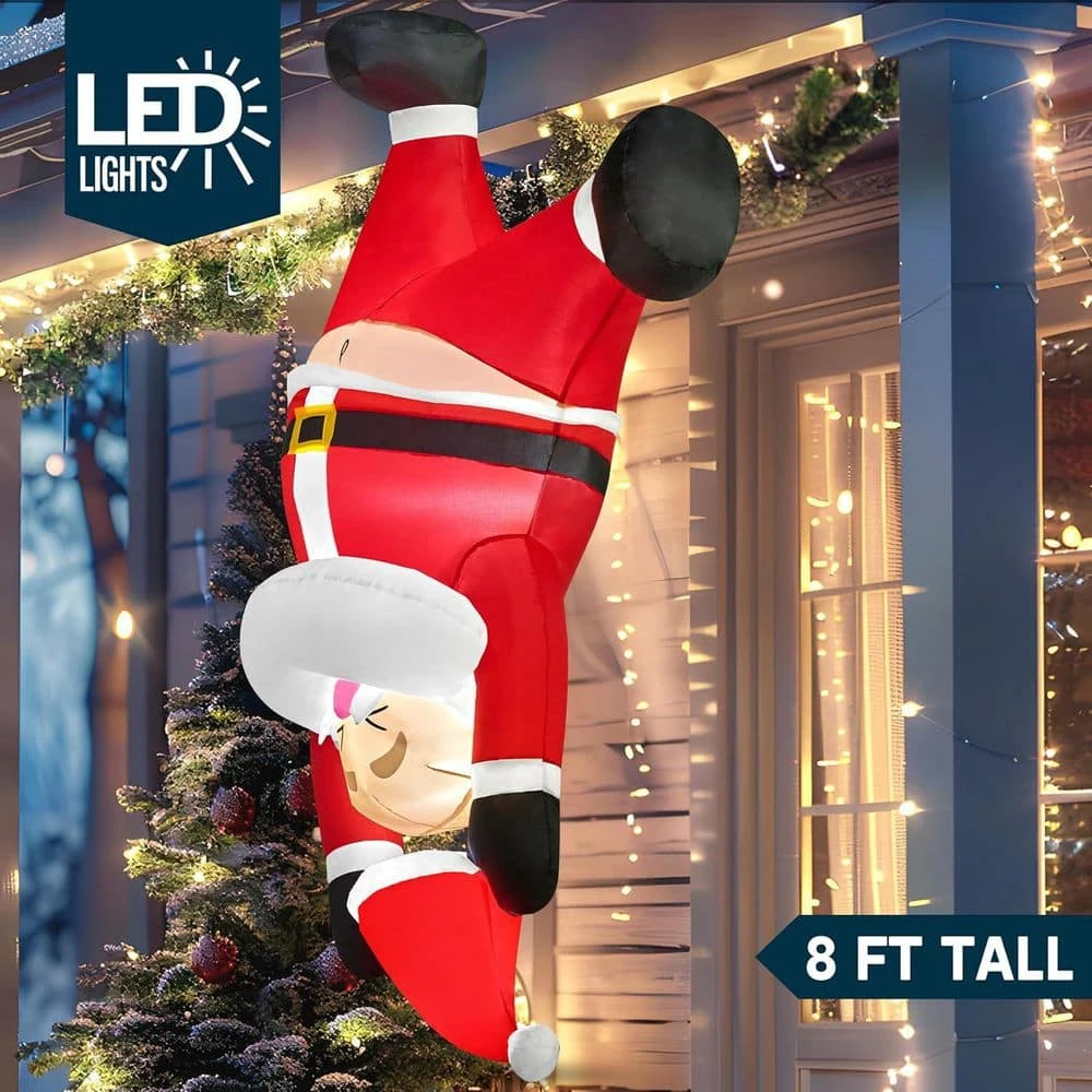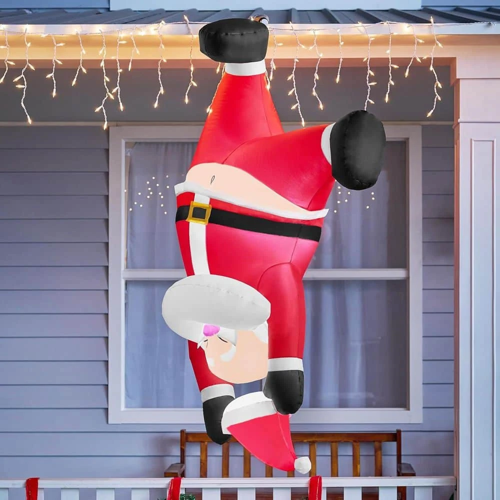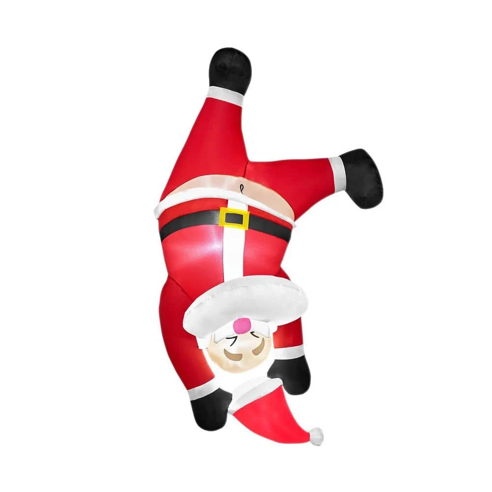 Create a playful holiday display with the 6 ft. Tall Hanging Christmas Santa Inflatables by Joyfy. This upside-down Santa inflatable features built-in LEDs, perfect for outdoor Christmas decorations. Its unique design makes it a standout piece for blow-up Christmas decorations or Christmas yard inflatables. Easy to set up, this Santa inflatable adds a fun twist to your holiday decor.