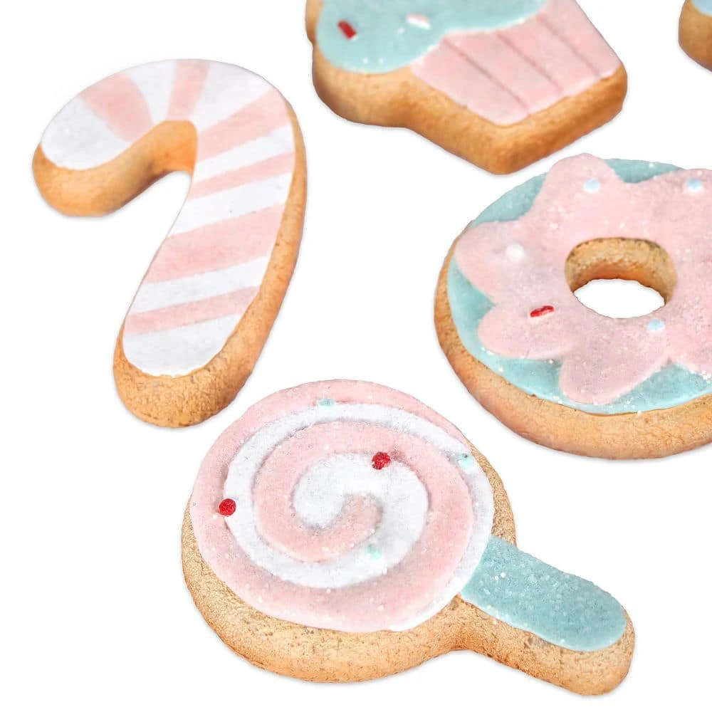 Designed with delicious detail, these six gingerbread cookies feature a different dessert shape. All finished in soft pastel colors. They are constructed with a combination of durable stone powder and poly resin materials with hand painted detailing.