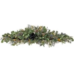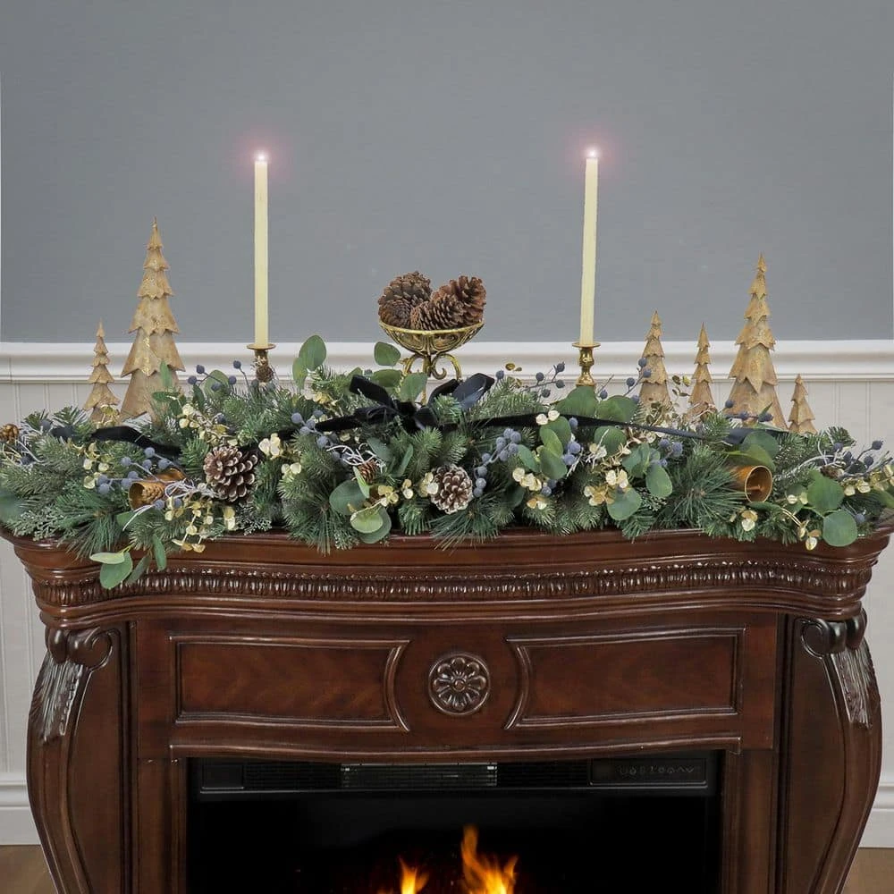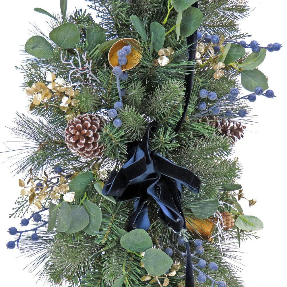 This Swiss Chic decorated mantle swag features a mixture of evergreen and bristle branch tips. They are tightly grouped together to form this holiday decor piece. It is trimmed with pinecones, leafy greens, white twigs, clusters of blue berries and gold metal bells.