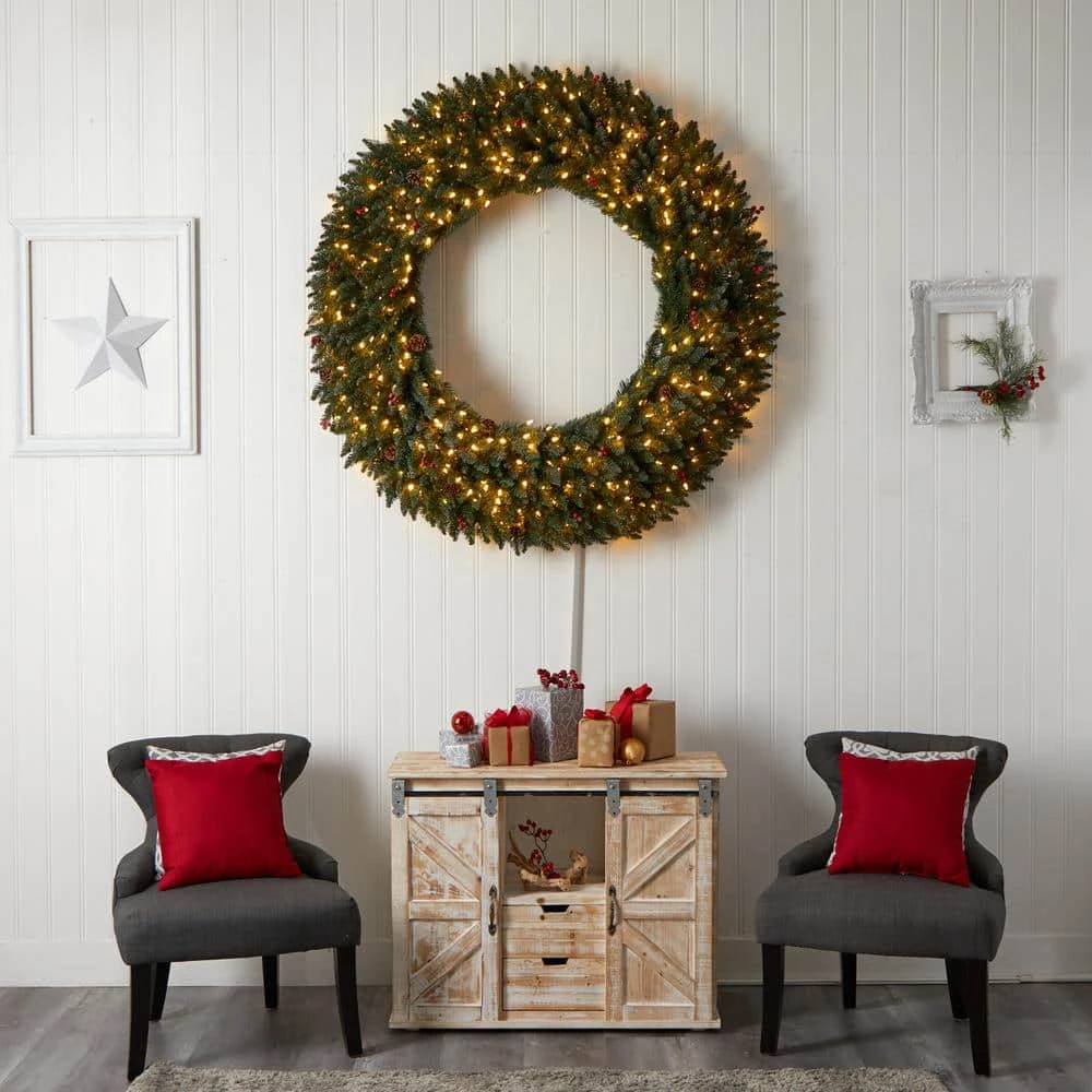 Add the WOW factor to your holiday decor with this flocked artificial Christmas wreath intricately designed from realistic looking pine foliage in a palette of seasonal evergreens flocked in a coat of faux-snow, carefully accented throughout with faux pinecones and berries that look incredibly realistic. Arriving pre-strung with 400 clear LED lights to effortlessly illuminate either a large wall or door, this 5 ft. (in diameter) decorative wreath makes for an inviting accent and will undoubtedly transform any entrance all throughout the holiday season. Perfect for a large space in need of some holiday cheer. Artificial wreaths are manufactured using synthetic materials, such as polyester material or plastic, and are well designed and constructed to be life-like in appearance. This item will need to be re-shaped when removed from the secure box to allow it to reach its fullest size. Your wreath will look beautiful for years to come, simply wipe clean with a soft dry cloth when needed.