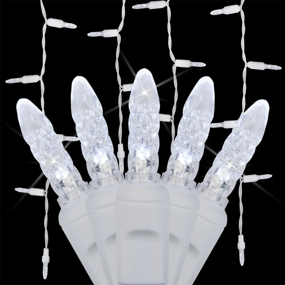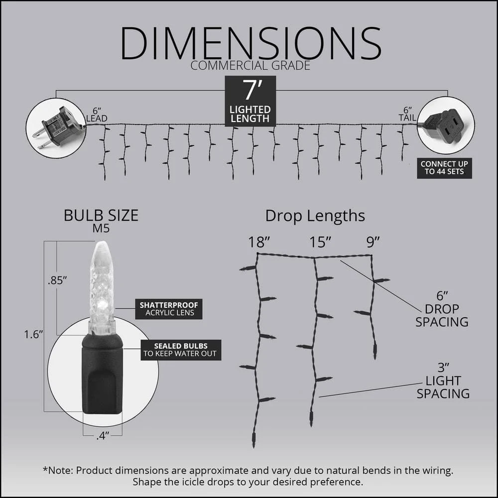- 70 cool white M5 LED twinkle icicle lights on white wire, 15 vertical drops in lengths of 18 in., 15 in. and 9 in., approx.7 ft. lighted string length
