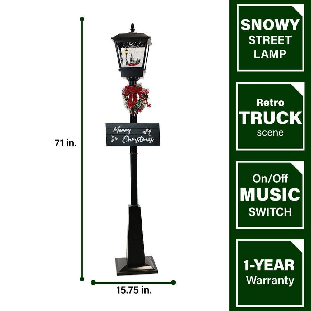 - Snowy Street Lamp: This 71-inch tall snowing musical street lamp with self-containing snow function is the perfect size for anywhere inside your home; Includes Let it Snow sign, Merry Christmas sign, berry-covered wreath, and classic red bow