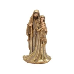 This 8.66 in. H simplistically elegant and detailed figurine of Baby Jesus, Mary and Joseph will warm the hearts of all who see it. Done in rich gold tones, you will be proud to display this anywhere in your home. This nativity set is perfect to display in your living room, or as a gift for family or friends.
