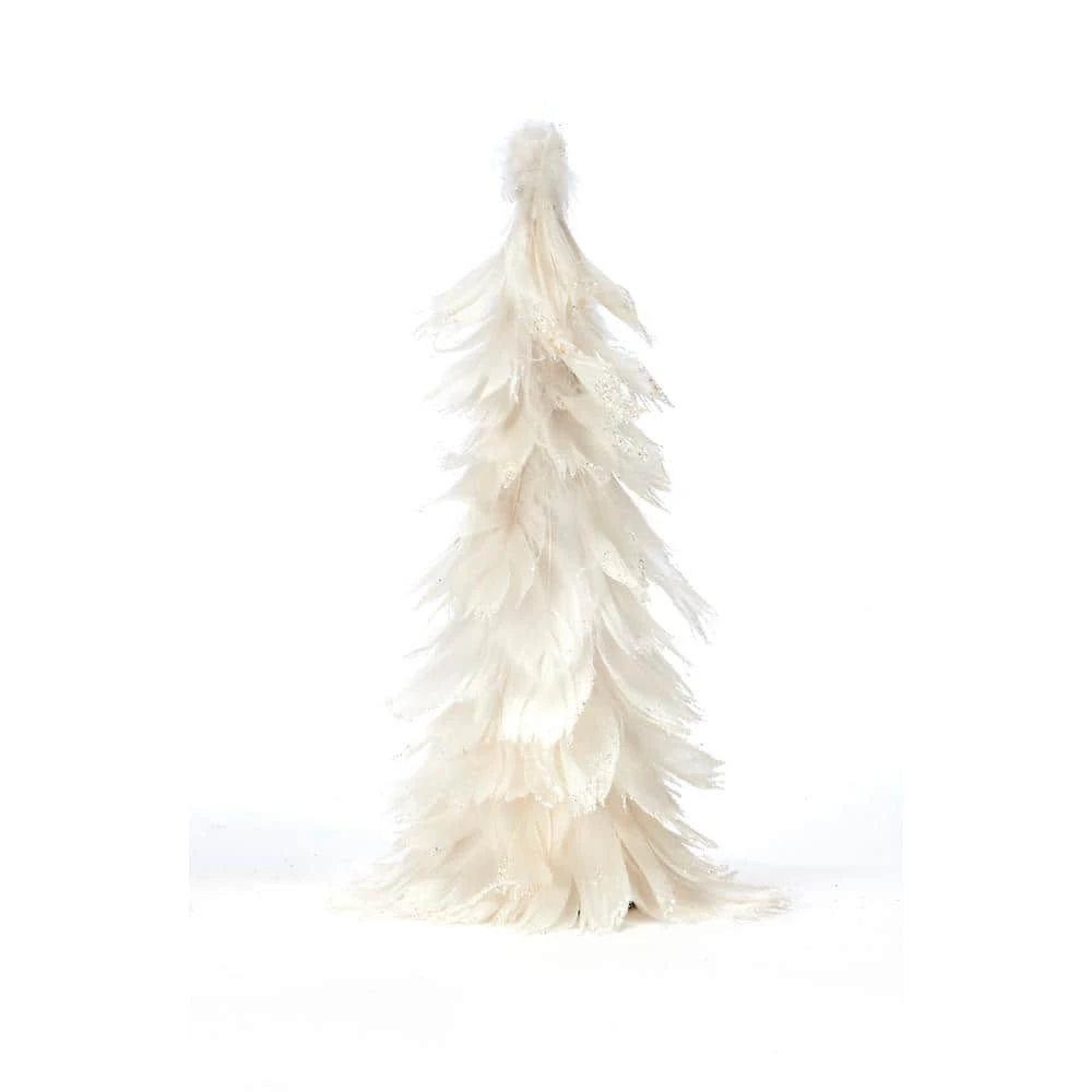 Add the perfect touch to your holiday with this tabletop feathered Christmas tree. The tree is made of real white dyed pretty airy feathers. There is a glitter edge of gold on each feather. Place on a mantle, table or workspace.