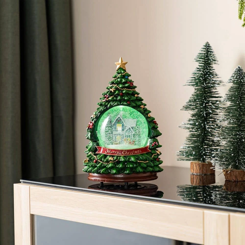 The 100 mm Christmas Resin Lighted Musical Snowflakes Christmas Tree Waterglobe features an enchanting snow globe centerpiece with a festive house and trees scene, enhanced by twinkling lights and a gentle snow effect. This charming holiday decoration plays classic Christmas melodies and is handcrafted from high-quality resin, adding warmth and musical cheer to your seasonal display. With its beautifully detailed Christmas tree design and magical winter atmosphere, this piece becomes a captivating focal point for spreading holiday joy in any home.