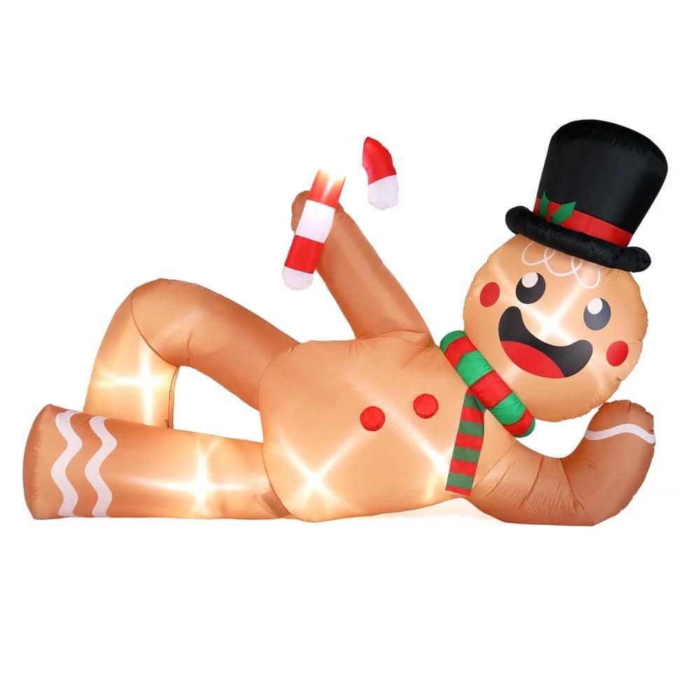 Celebrate the season with our 9.8ft Inflatable Lying Gingerbread Man, a fun and festive addition to your Christmas decorations. This charming gingerbread man features LED lights that create a cool and inviting glow. Designed to be easy to set up and store.