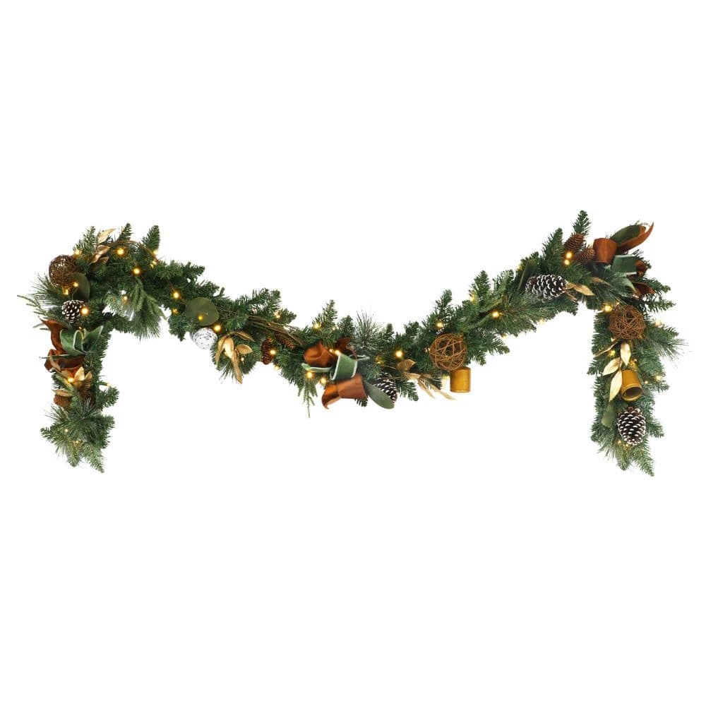 - 9 ft. Lifelike pre-lit decorated Christmas garland: 155 PVC and 7 PE life-like pine needle branches and 100 UL-Listed clear lights adorned with pinecones, bells and ribbon create the natural and elegant look of a decorated real Christmas garland for a timeless holiday accessory