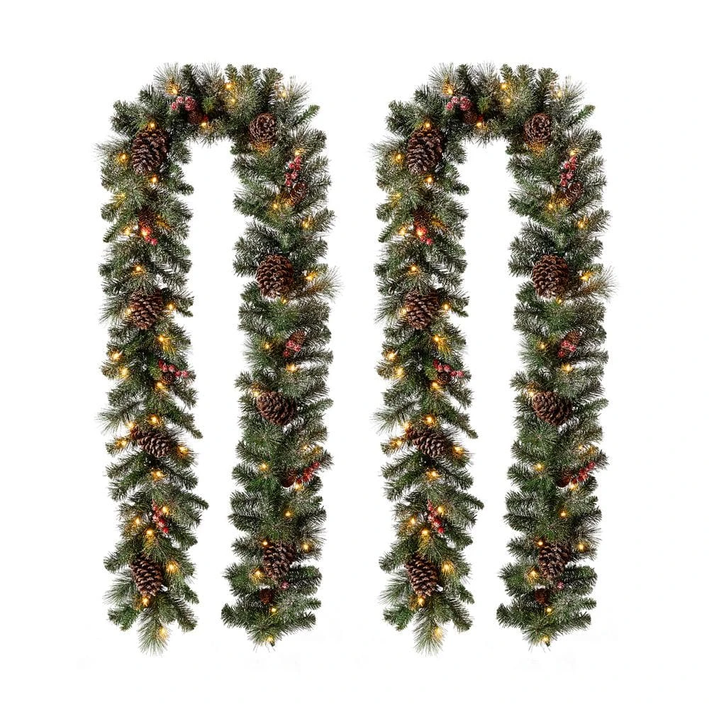 The 9 ft. garland provides ample length to easily adorn doors, mantles or banisters, making this versatile decoration ideal for any situation. Each of the 180-tips is modeled to a pine trees while the frosted design creates a Winter wonderland around your home. Several large pinecones and berry decorations among the needles add an extra holiday touch to this garland. It creating the perfect holiday touch for your home.