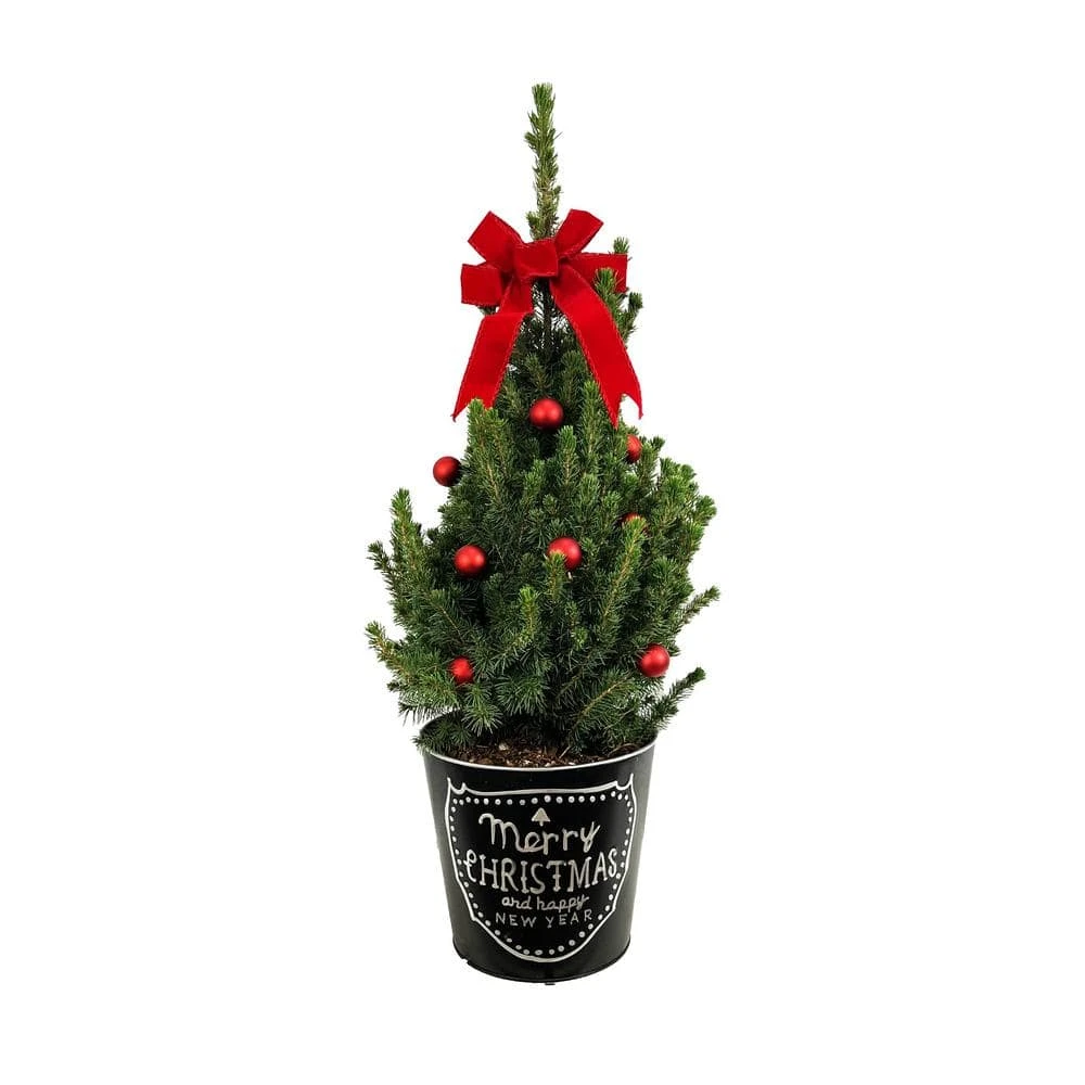 This spectacular Spruce tree is a traditionally loved feature of the holiday season. Including this live tree will offer festive fun to the decorations around your home. This spruce is perfectly shaped and holds pristine green foliage that will brighten the entire holiday season. The spruce is planted in a black Merry Christmas pot and sports a vibrant red bow that will make decorating your home as simple as taking it out of the box.