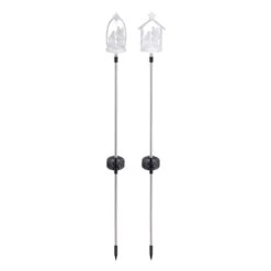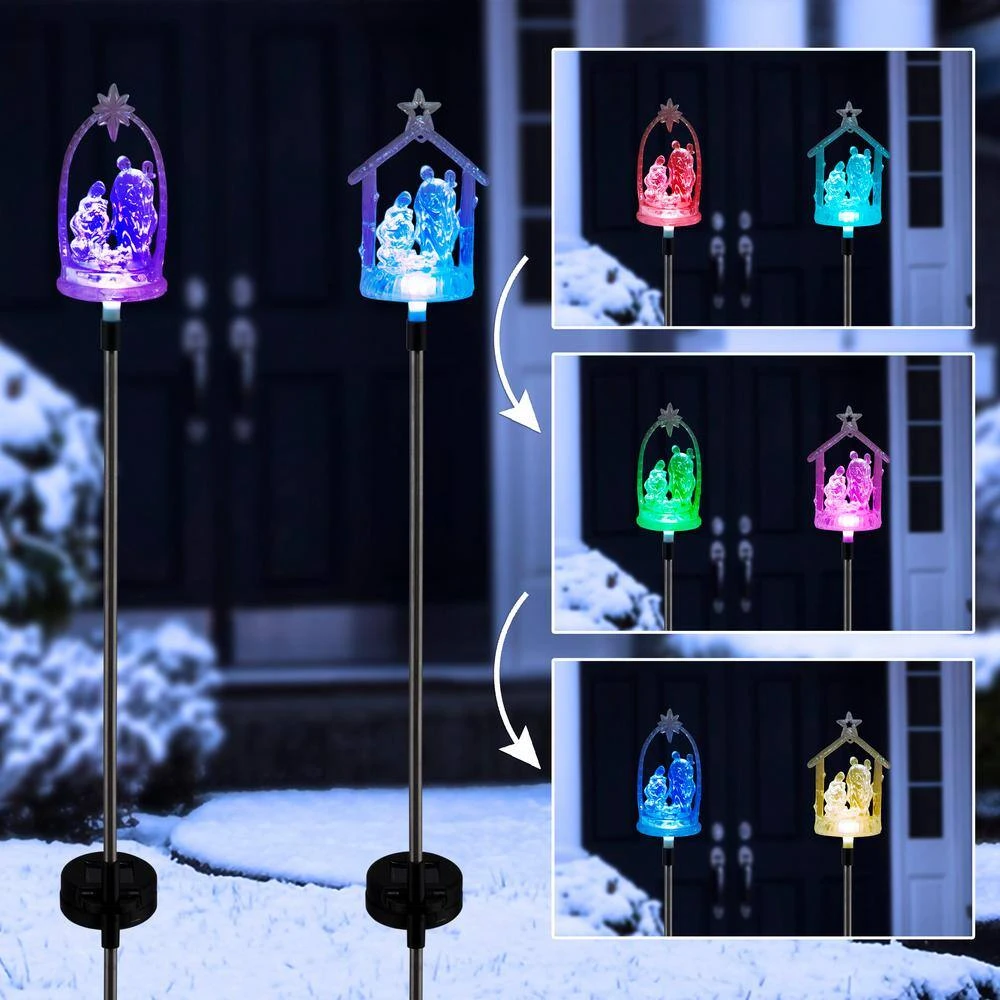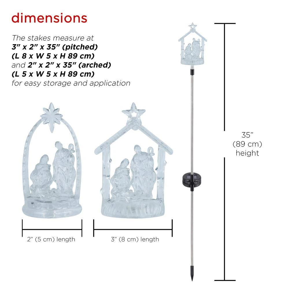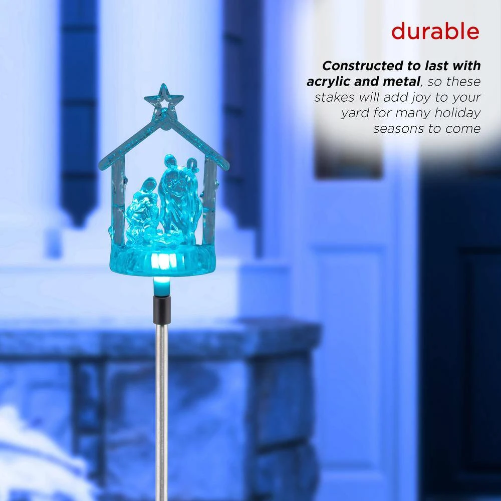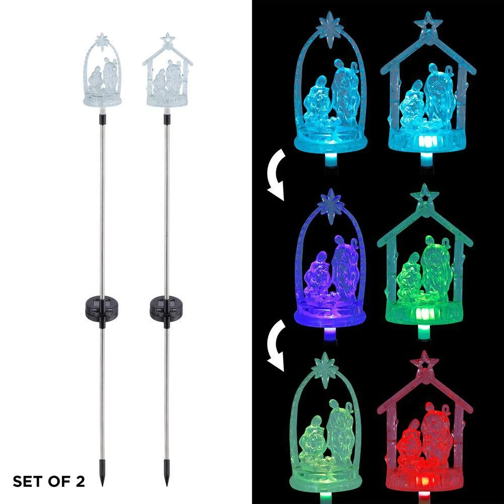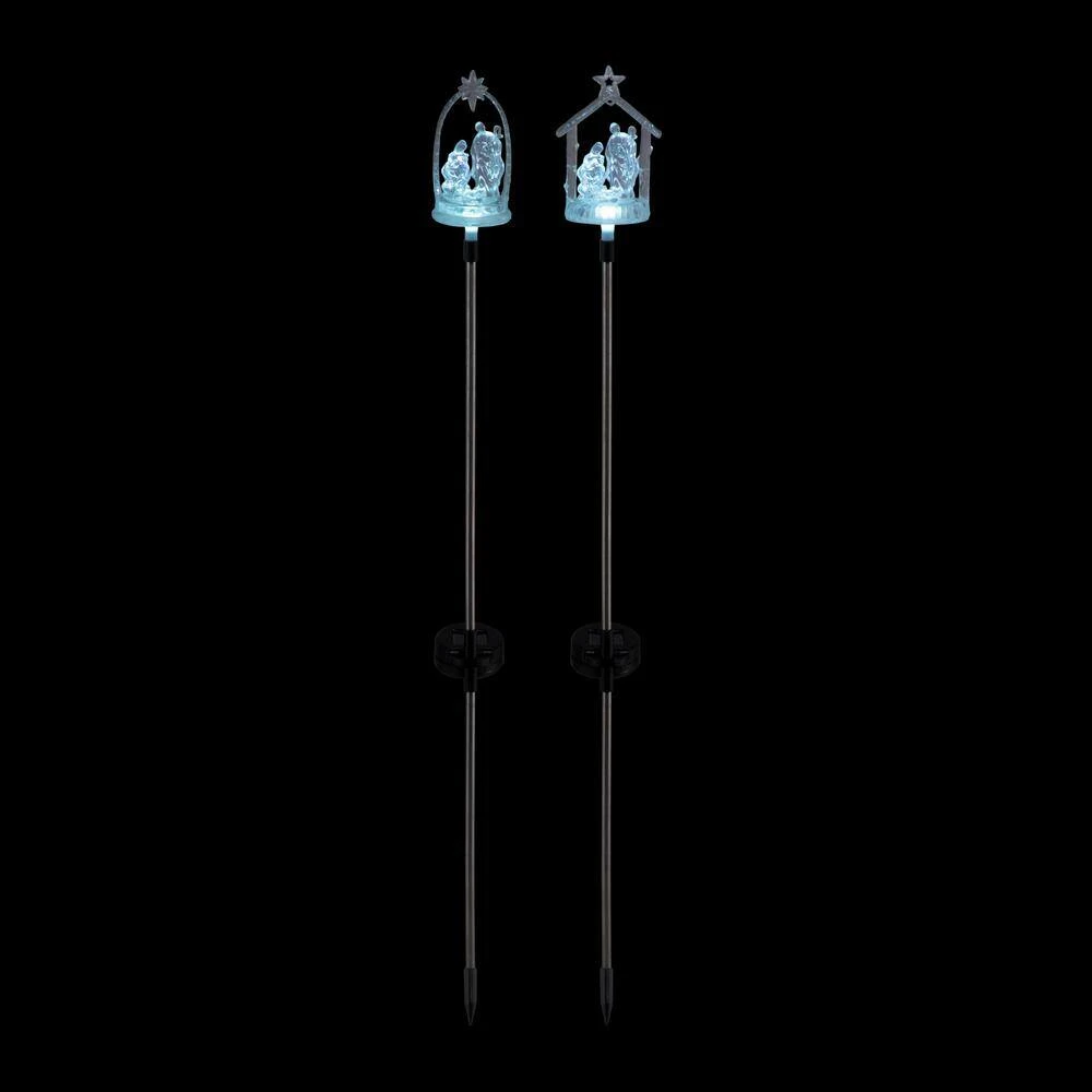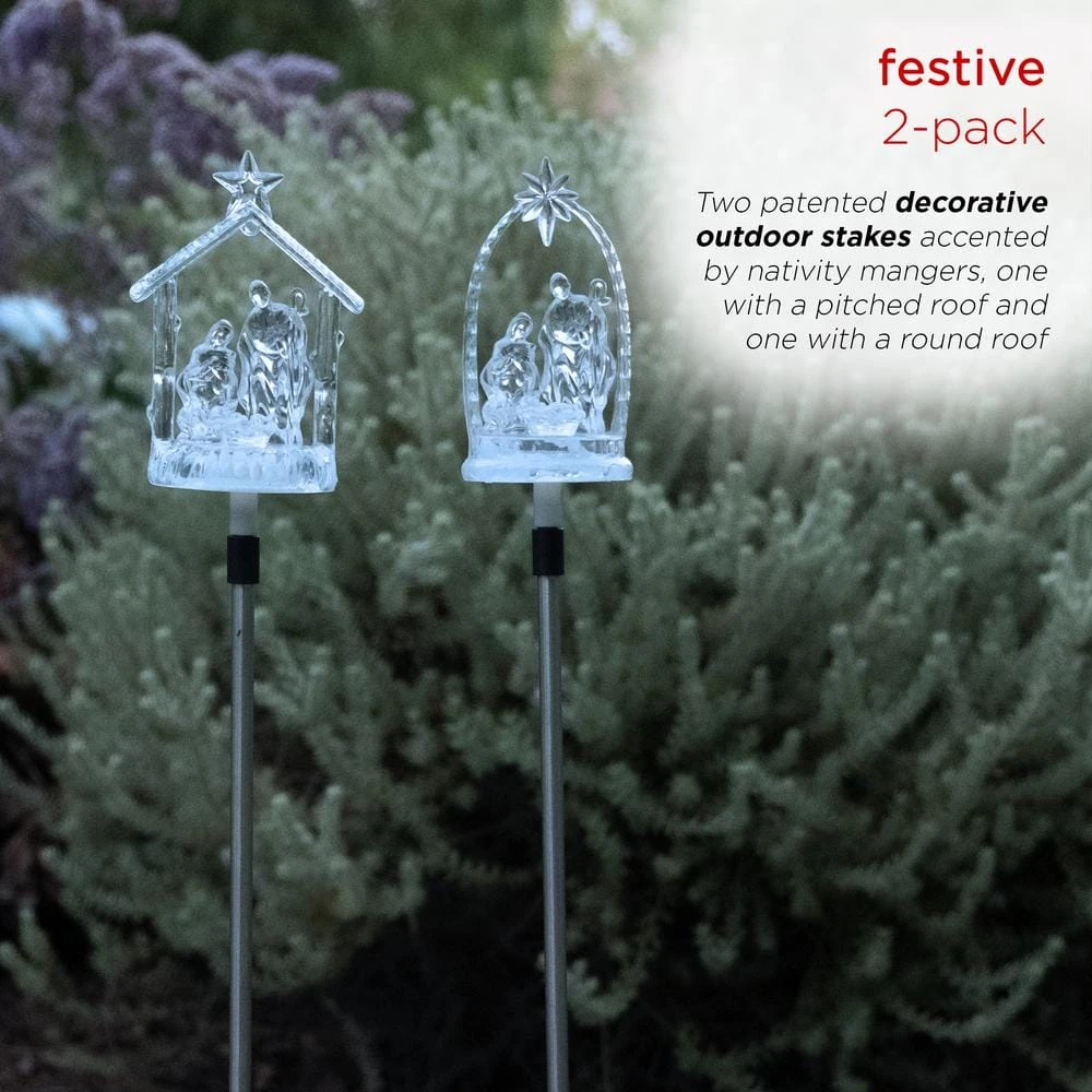 - Festive 2-pack 2 patented decorative outdoor stakes accented by nativity mangers, 1 with a pitched roof and 1 with a round roof