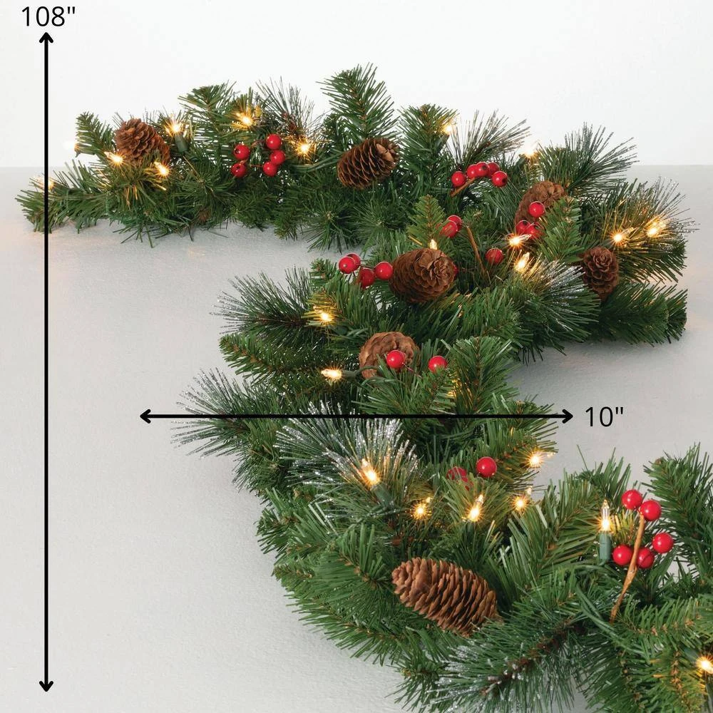 - Prelit with Warm White LED Twinkle Lights: Illuminate your indoor Christmas decorations with this lighted garland. Prelit with warm, white LED lights, it casts a cozy, inviting glow, making it an eye-catching addition to your Christmas garland decorations.