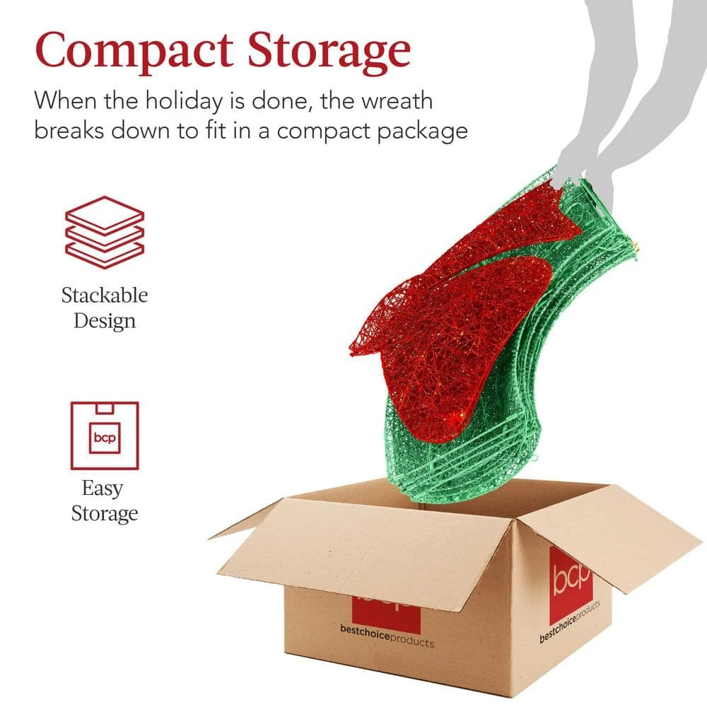 Celebrate the holidays in a big way as 3 ft. of festive lights and color bring the holiday spirit to your home! A combination of 70 lights on the main body and 30 bow lights are pre-strung to save time and spread the holiday spirit. This Wreath and Bow Set includes environmentally friendly LED lights that remain cool to the touch and last for hours of on-theme displays. Durable materials withstand damage and wear during the harsh winter months. The metal and fabrics are rain-resistant, snow-resistant, and wind-resistant so no matter the weather you can have confidence in your decorations. This set comes together with three easy steps: Step 1: Interlock the wreath and bow sections. Step 2: Attach the bow to the wreath. Step 3: Hang outside, plug in, and enjoy. The stackable design allows for easy storage, so when the holiday is done, the wreath breaks down to fit in a compact package.
