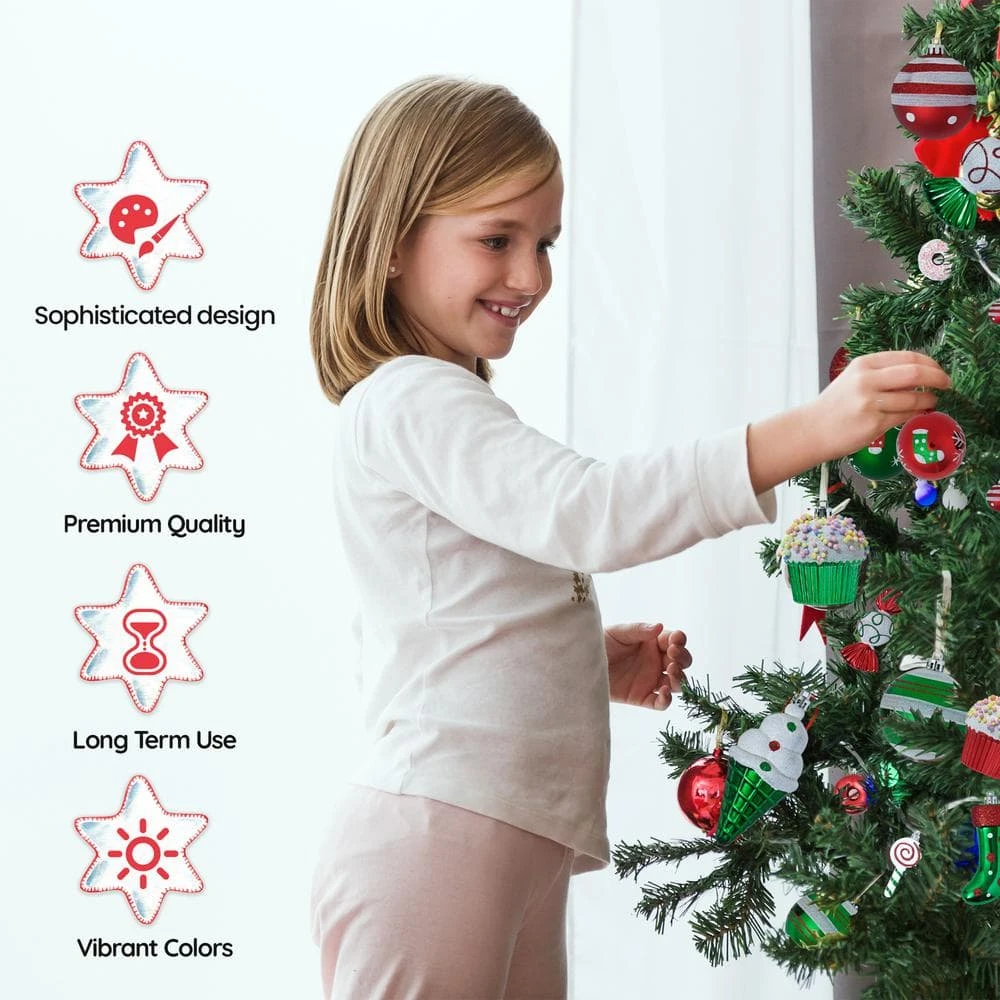R N’ D Toys Candy Land Themed Christmas Tree Ornaments set is the ideal ornament kit to create your dream Christmas tree. It’s the perfect holiday decor for any setting, including your home, your office, a corporate party room, a commercial business conference room tree, and more. R N’D Toys ensures each ornament is made of shatterproof materials, without compromising on beauty. As a result, these balls are the combination of beauty and practicality, They are the ideal decorations for a home with kids or pets, where the ornaments can be beautiful but unbreakable. This set includes designs of donuts, cupcakes, lolly pops, candies ice cream, a Christmas stocking, and assorted ball ornaments. The ball ornaments included are matte red, shiny red, glittered red, matte green, shiny green, glittered green, glittered white, printed white on green designs, and printed white on red designs. These ornaments have a hook that makes it easy for ornament hooks to fit in. These ornaments are a favorite among kids and will get them drooling before they even get any candy. Get this Candyland Christmas themed ornament set, and you will not be disappointed.