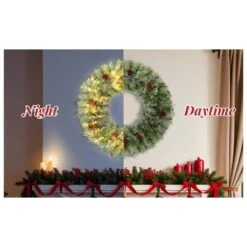 2 PCS 24in Pre-lit PVC PE Artificial Christmas Wreath With Warm Lights And Red Berries Pine Cones