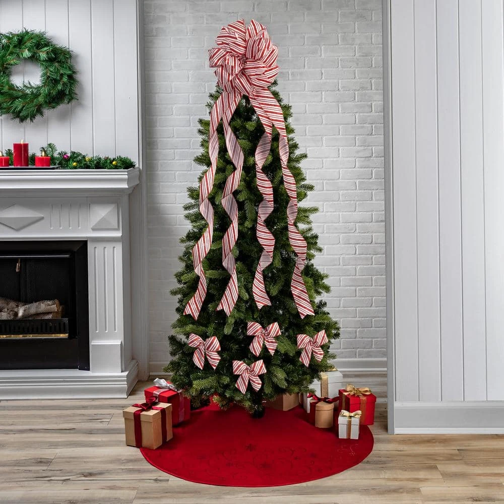 The New Traditions Large Christmas Tree Topper Bow and 12 Mini Bows Bundle is an elegant addition to any holiday decor. The set is made from designer-quality satin ribbon with wired edges, making both the loops and tails effortless to style and shape. A single extra-long bow fashioned from wide satin ribbons can be used as a Christmas tree topper or arranged with a few Christmas ornaments as a focal point holiday decoration on a mantle, front door or porch railing. The lavish decorative bow measures 11 in. across and features sixteen loops made from 2.5 in. W satin ribbon in a festive pattern of white fabric with red glitter candy cane stripes. The tails are fashioned from the same wired ribbon and measure 53 in. L. The set also includes twelve smaller 2-loop decorative bows measuring 5 in. x 5 in., crafted from 2 in. satin ribbons in the same satin candy cane stripe fabric. The built-in twistable wires make them easy to attach to Christmas trees, holiday wreaths, bannisters, railings, mantles and anywhere else you might want to decorate with these festive holiday trimmings. Perfect for both indoor and outdoor decoration, these durable, high quality Christmas bows are reusable holiday decorations year after year.