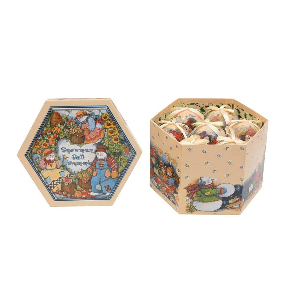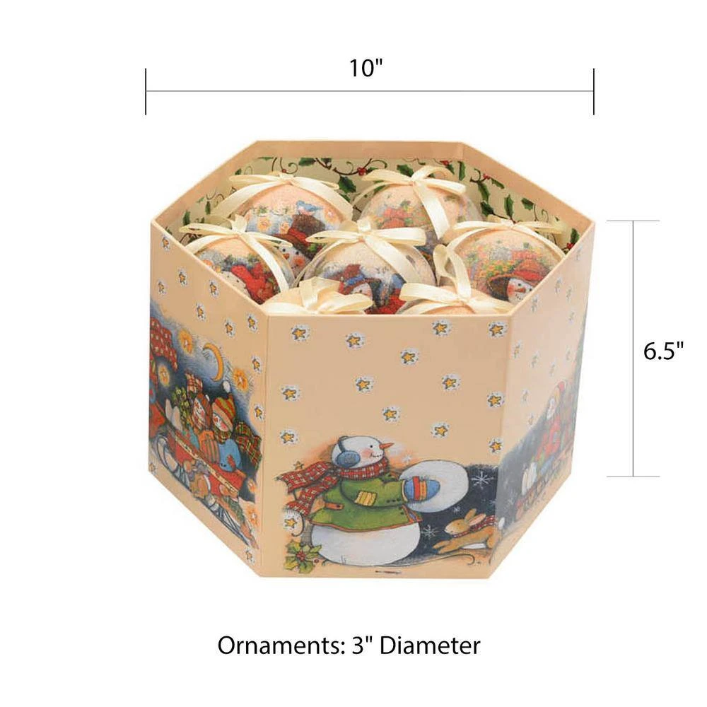 Country snowman family is having some down home, outdoor fun. They enjoy skating, sledding and playing in the snow. Beaded glass, lightly frosted ornaments feature illustrations of old fashioned snowmen and are complete with ivory color ribbon ties. Each set of 14 features a variety of ornament designs and includes a designer gift box that doubles as storage for safe keeping. Celebrate family memories with these affordable, quality ball ornaments. Each individual ornament is 3 in. Dia x 3 1/2 in. H.
