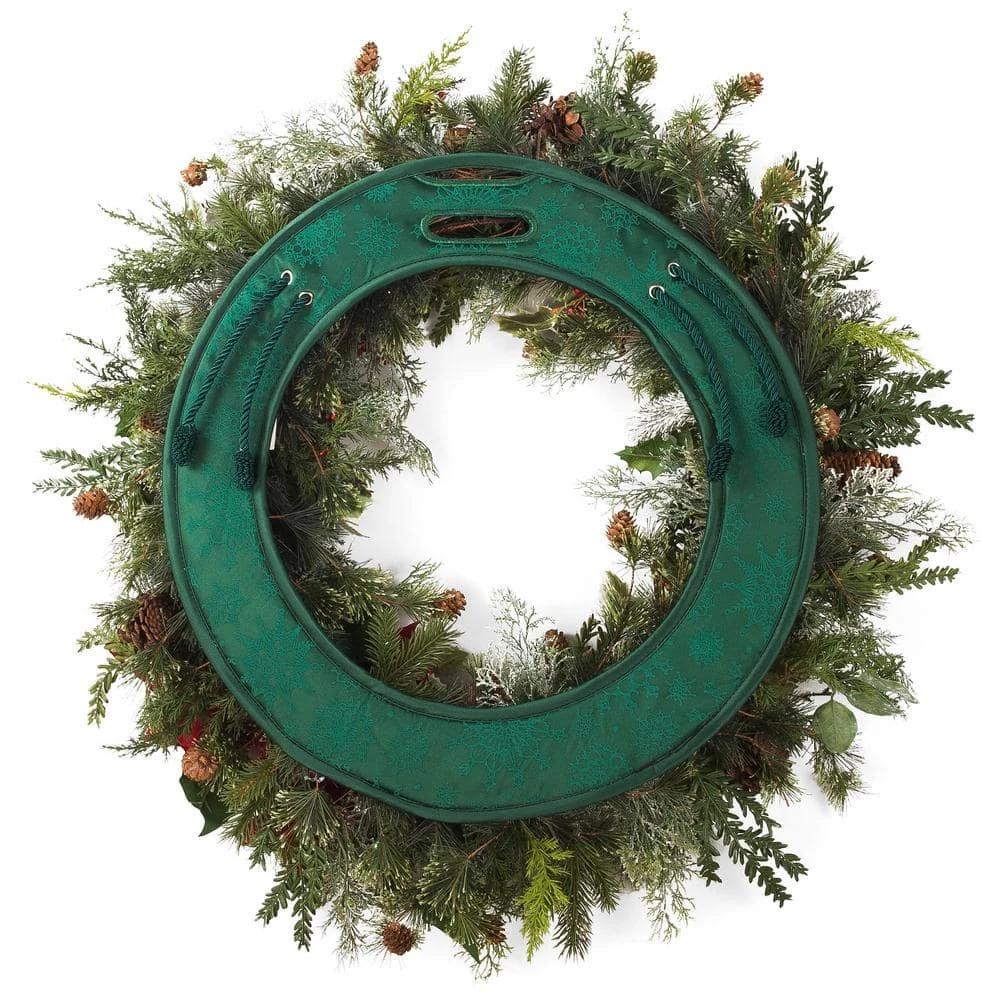Hanging a wreath on your front door gives your home a welcoming entrance that leaves your visitors stunned. After time though, the wreath causes damage to your door through rubbing against it. The Door Saver is designed to protect your door from dings, dents and scratches caused by wreaths. The easy-to-attach protective pad secures directly to the wreath’s frame using twist ties. Padded for extra protection, the pad has 2 slots to allow access for your wreath hanger to hook onto the wreath’s frame. The wreath pad fits most 24 in. Wreaths. The festive green fabric is embossed with a snowflake pattern to complement the beauty of your wreath while staying discreet.