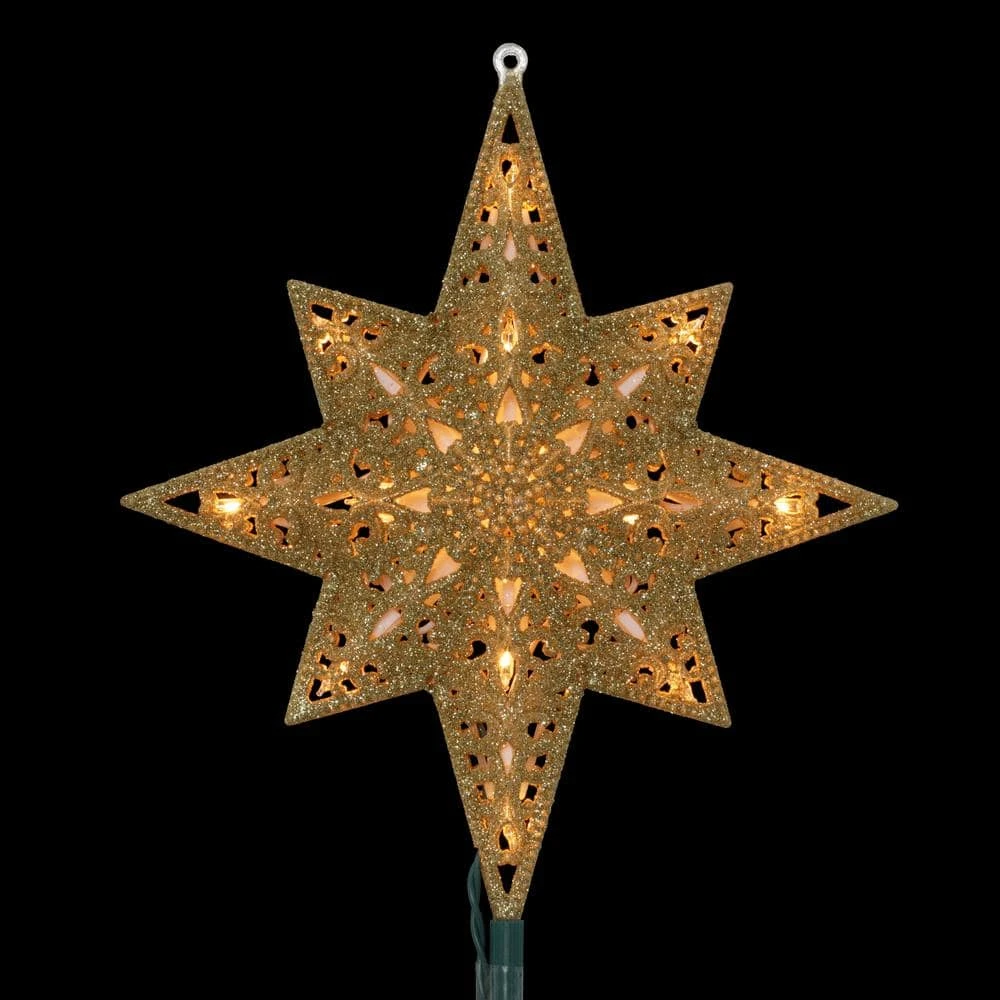 Add elegance with the General Electric Holiday Classics 16 light gold glittered Bethlehem Star tree top. There is a 24 in. lead wire, green cord set with clear bulbs and fused plug. Size: 11 in. tall x 10 in. wide.
