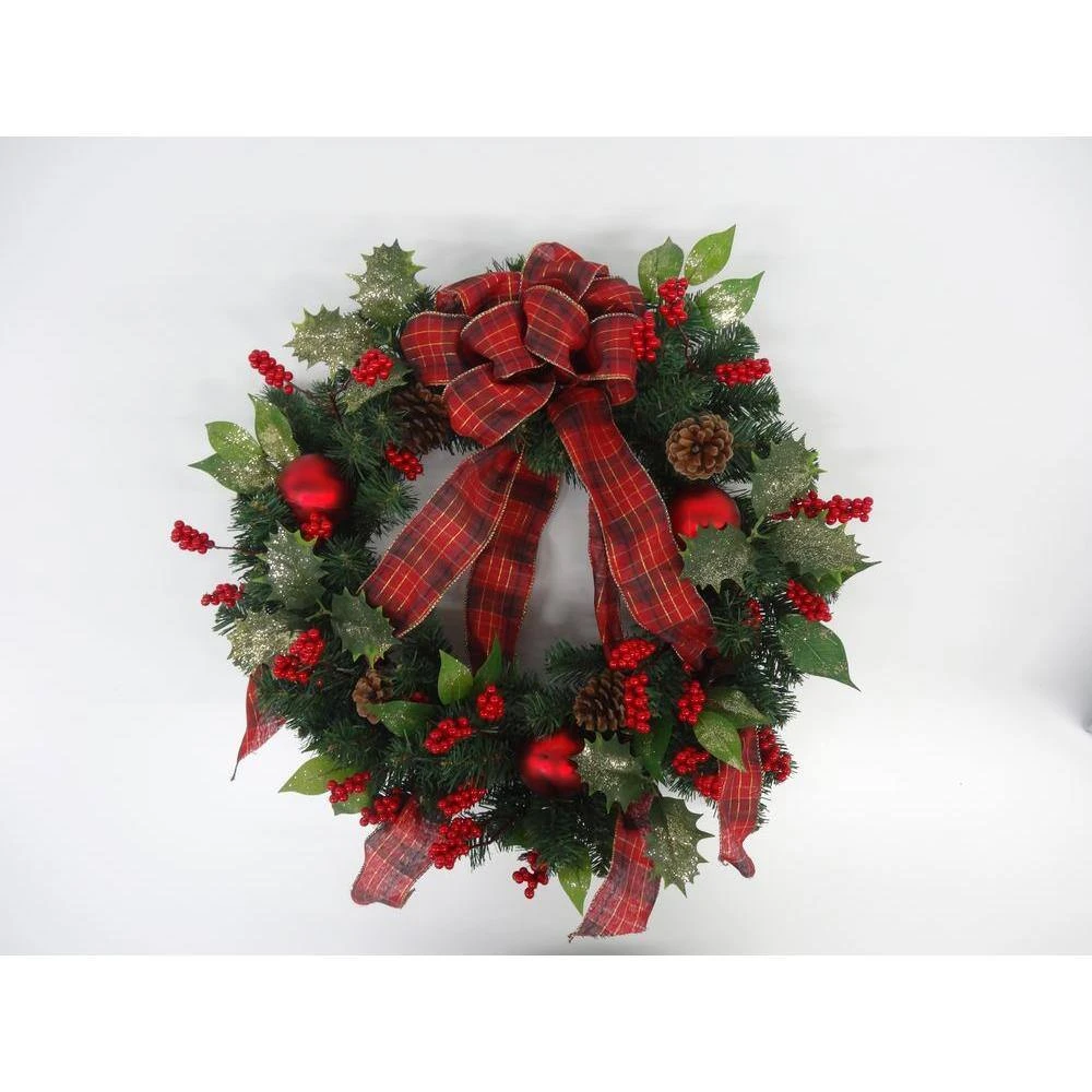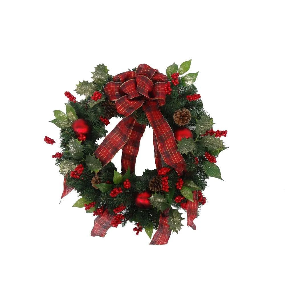 Bring Christmas cheer to your home with a classic wreath. Display this 24 in. Holly Traditions Artificial Wreath on a door or wall or in your entryway this holiday season. It comes already decorated with red berries and wrapped with a plaid ribbon, so all you have to do is find the perfect spot to hang it.