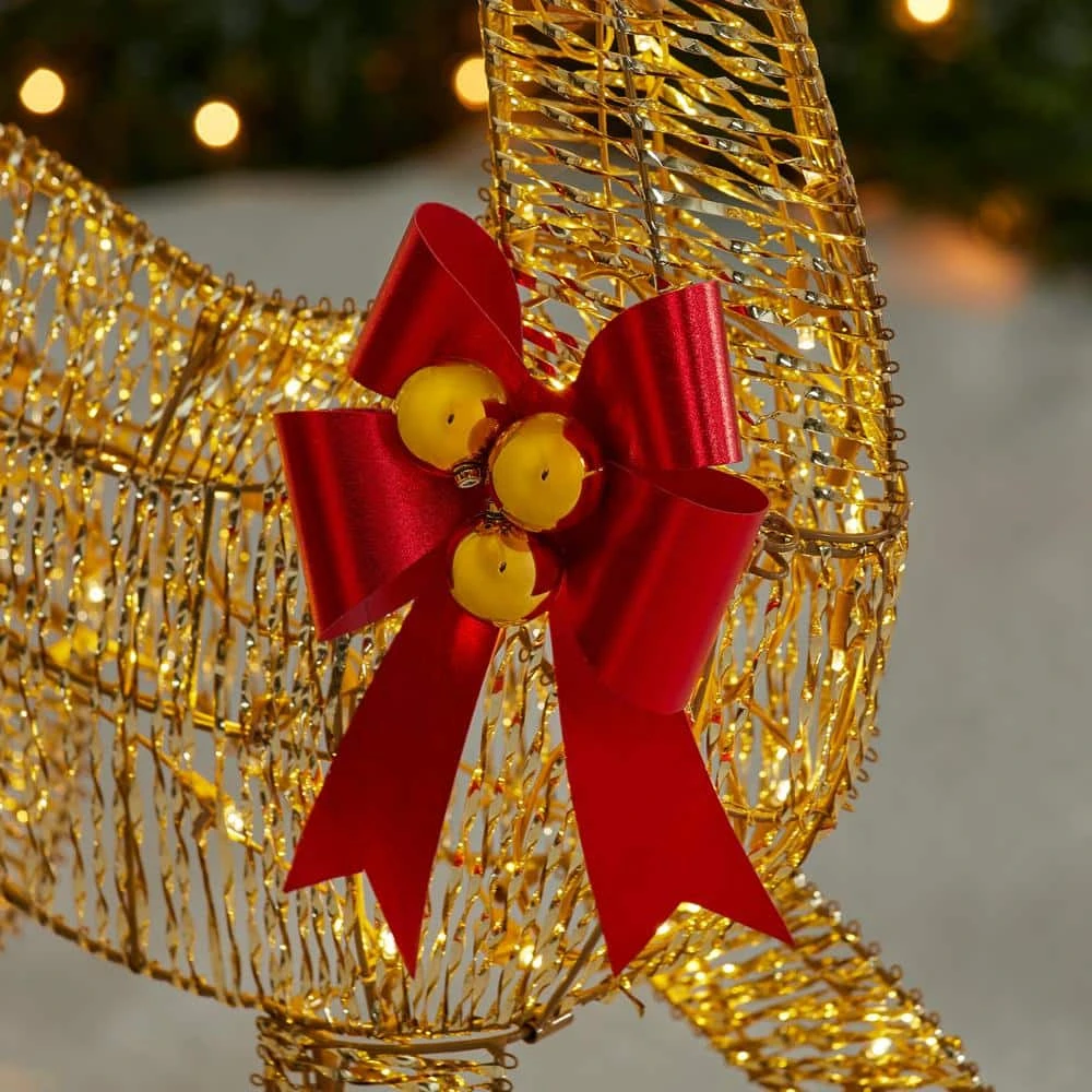 Create a festive Christmas display with this this 5 ft. Polar Wishes LED Golden Standing Buck from Home Accents Holiday. This deer set is suitable for indoor or outdoor use. It has 90 warm white LED lights and a durable pre-wired metal frame. It plugs into a standard outlet for flexible placement. Ground stakes, spare bulbs and fuses are included. It’s the perfect yard decoration for your home, front porch, or yard. Pair with other Polar Wishes holiday items.